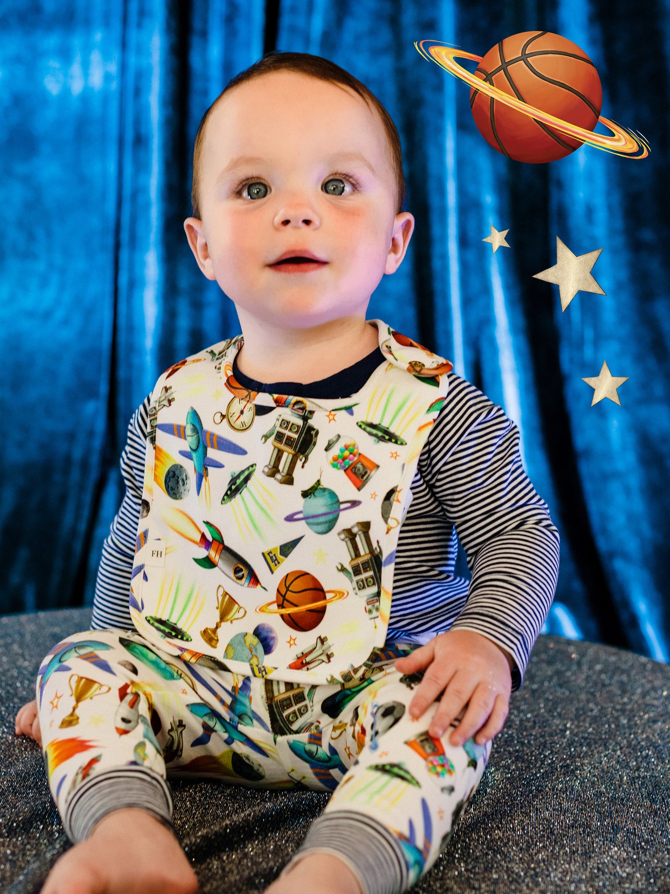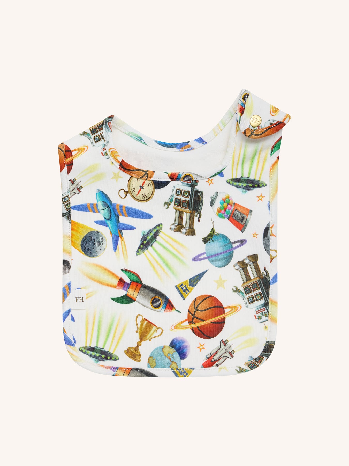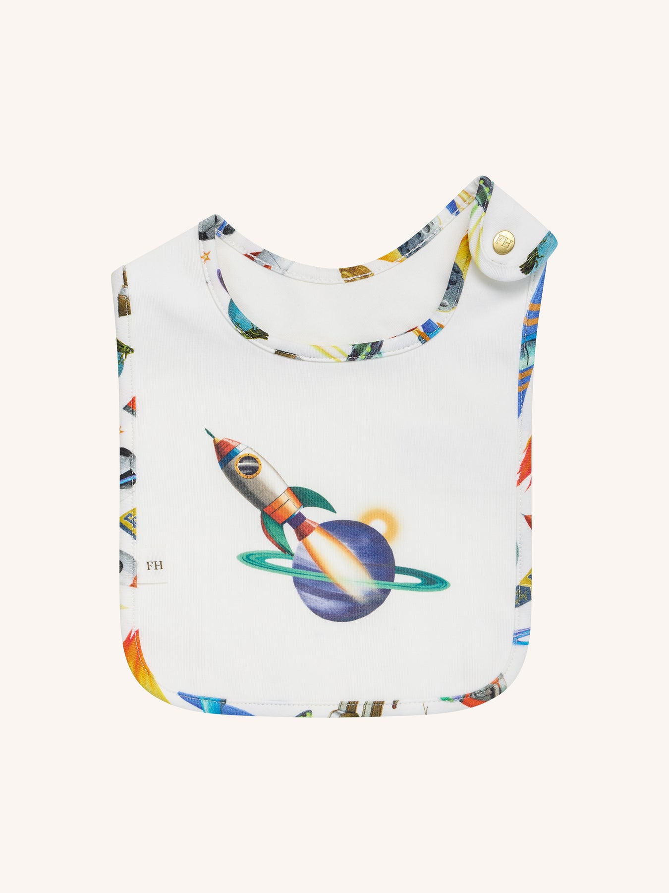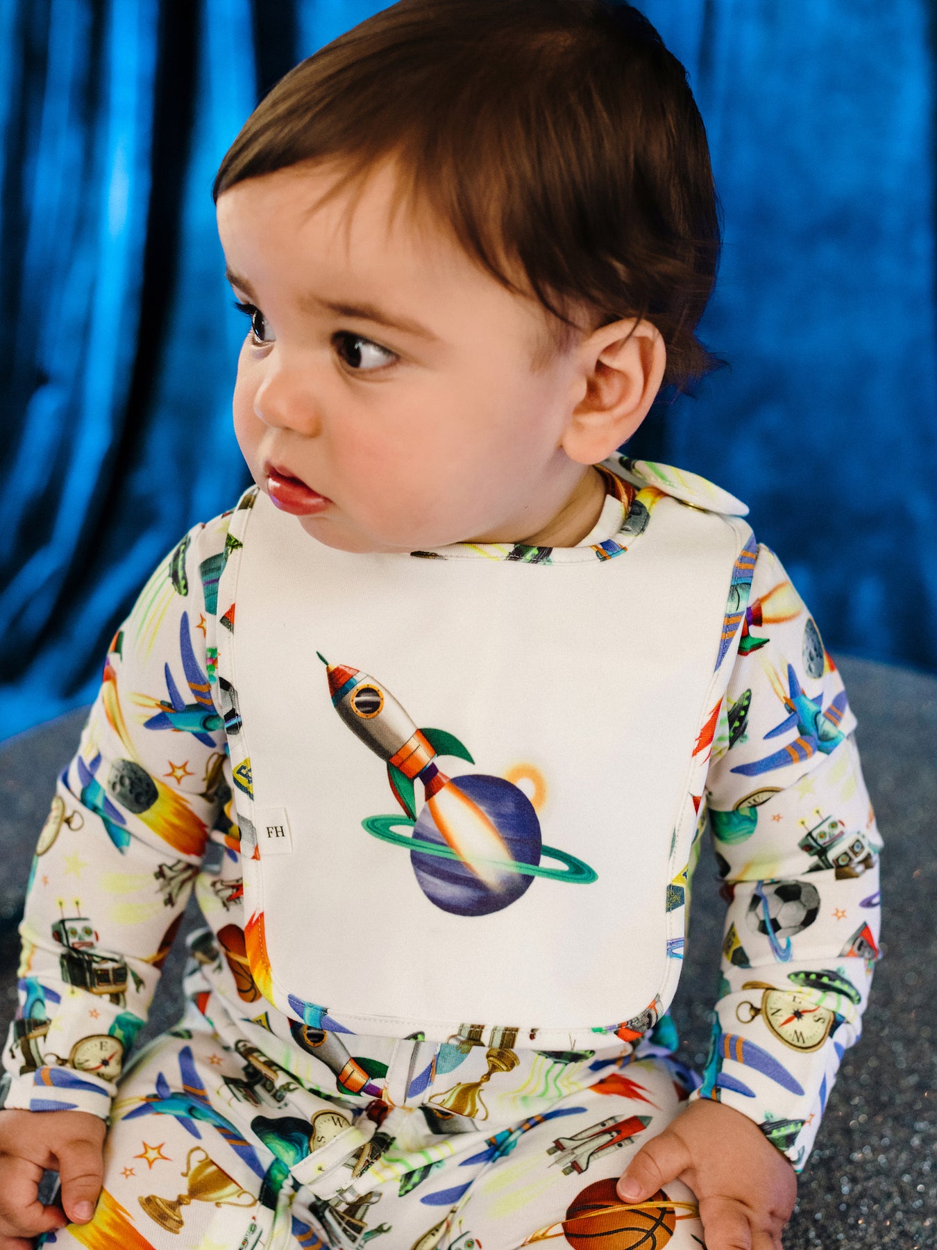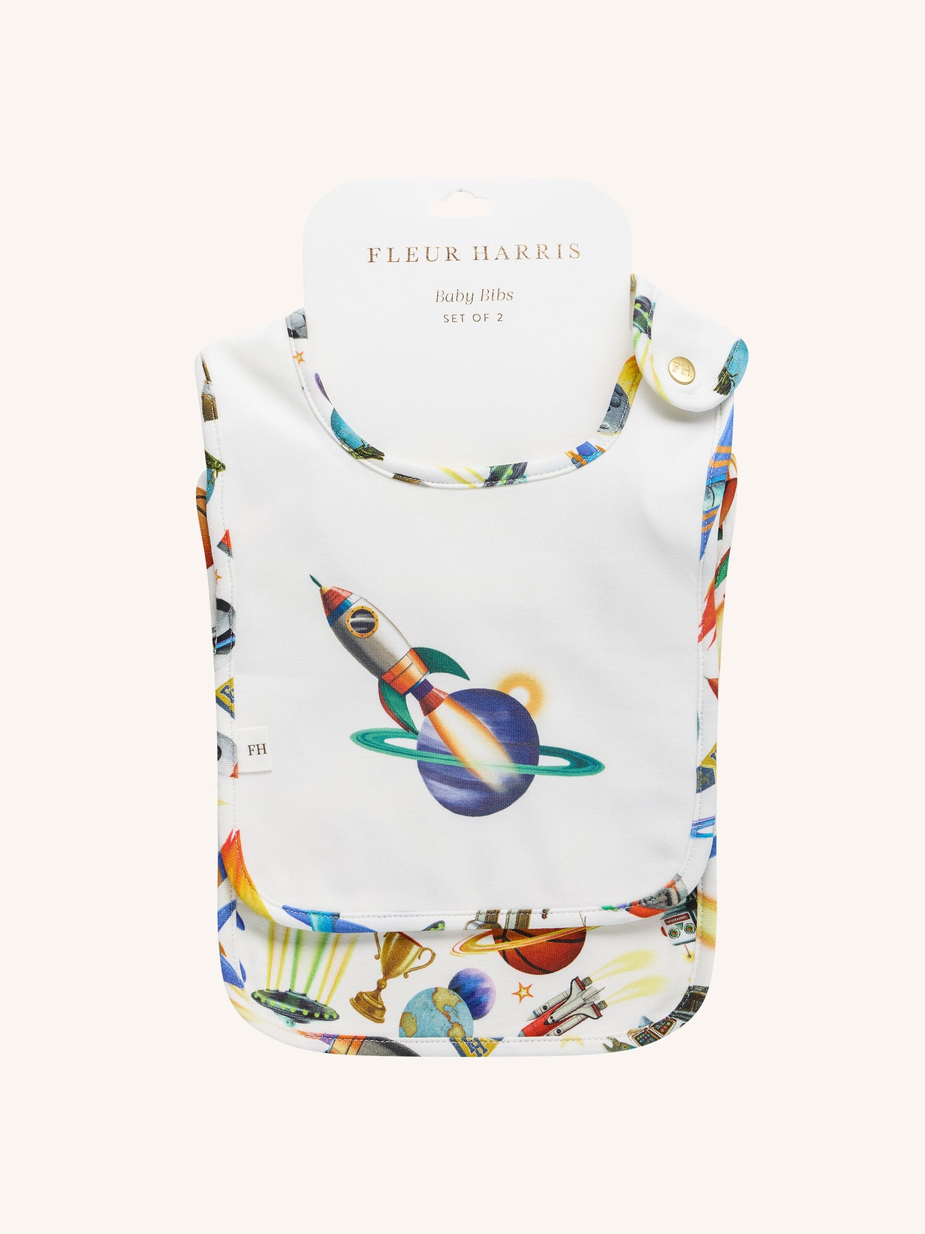 Gear up your little adventurer with the ‘Blast Off’ Dandy Duo Bibs from the Fleur Harris 'Out of This World' collection. Crafted from soft cotton elastane jersey with digitally printed artwork, this 2-piece bib set features a gold snap closure for easy use. Perfect for messy mealtimes or playtime, these bibs combine practicality with storybook-inspired charm.