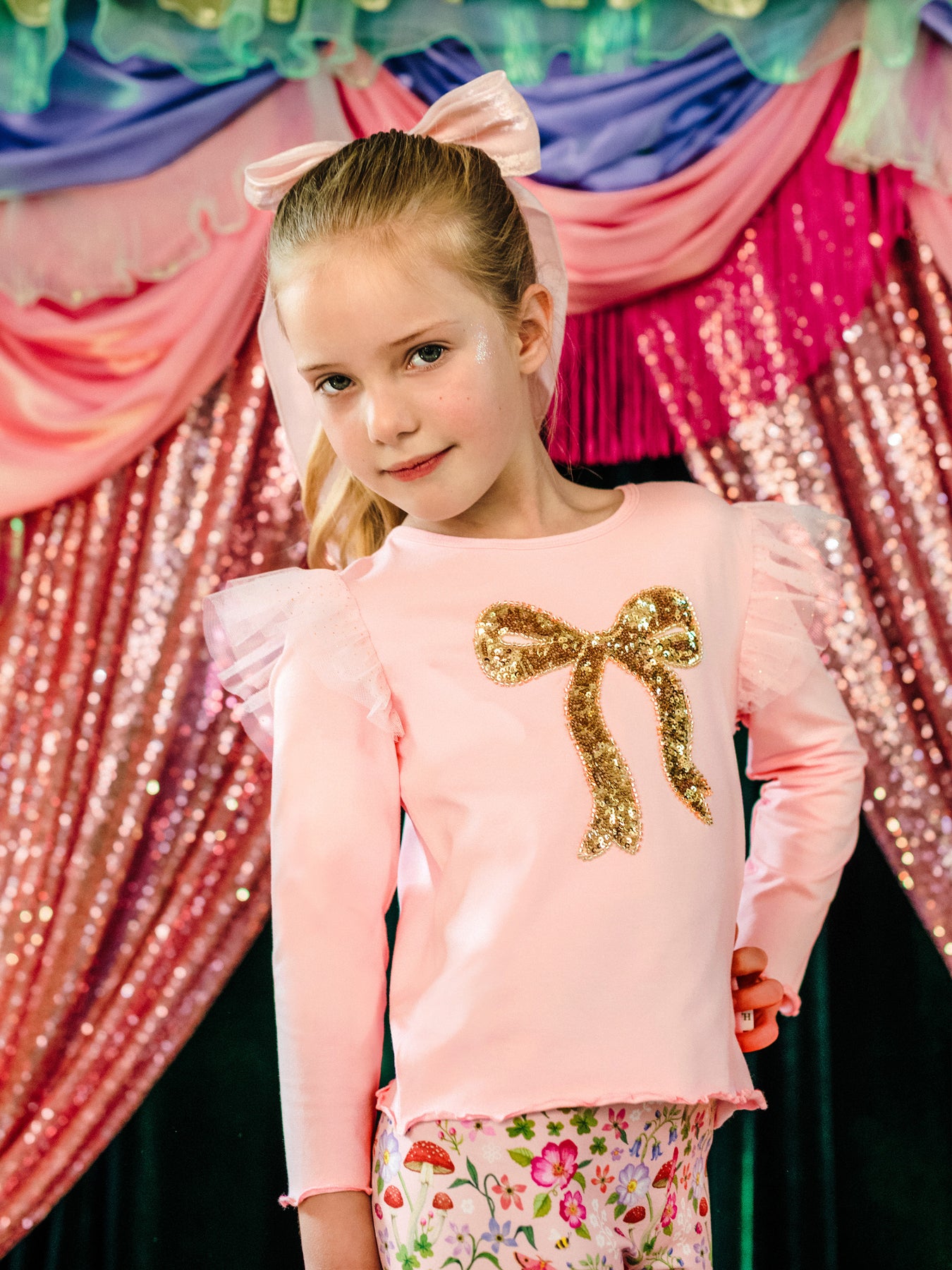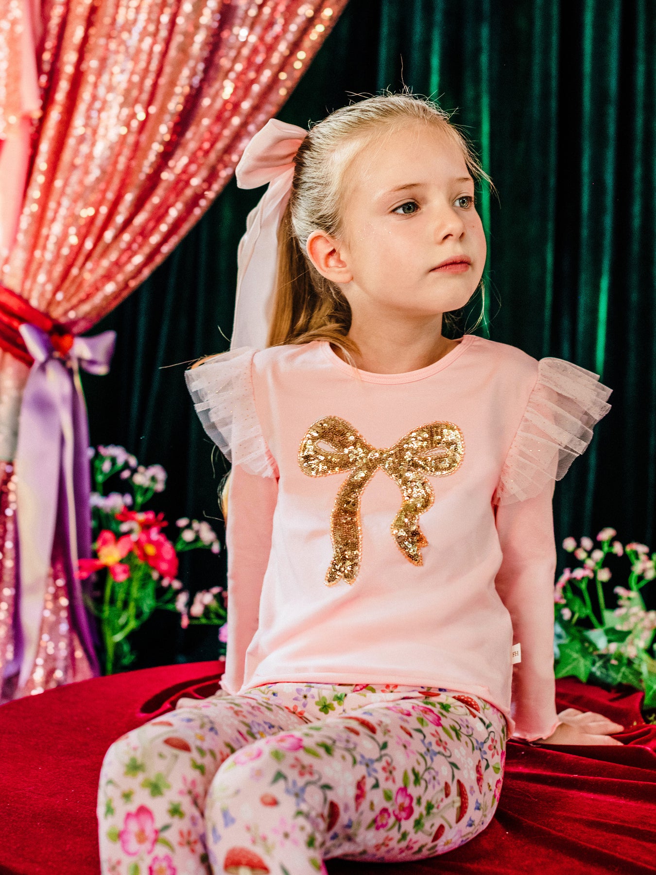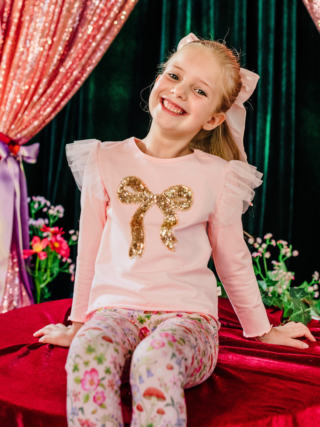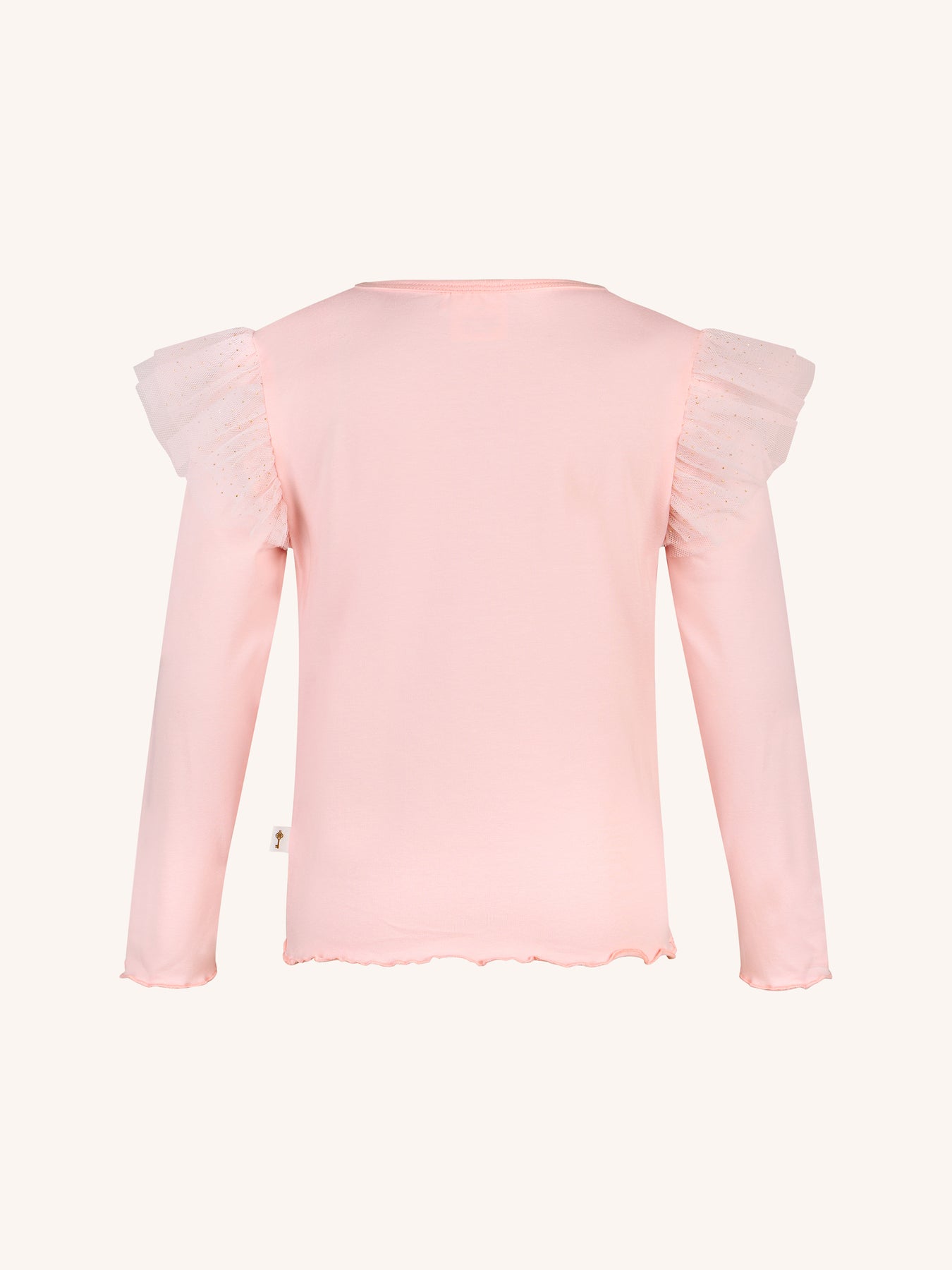 The Bow Tee in Peach from the Fleur Harris 'Days of Enchantment' collection adds a touch of sparkle to everyday wear. Crafted from soft cotton elastane jersey, it features dual-layered gathered tulle frills at the shoulders and a gold sequin bow motif. With long sleeves and baby lock hems for a neat finish, it’s a delightful tee to pair with leggings or skirts for a charming look.