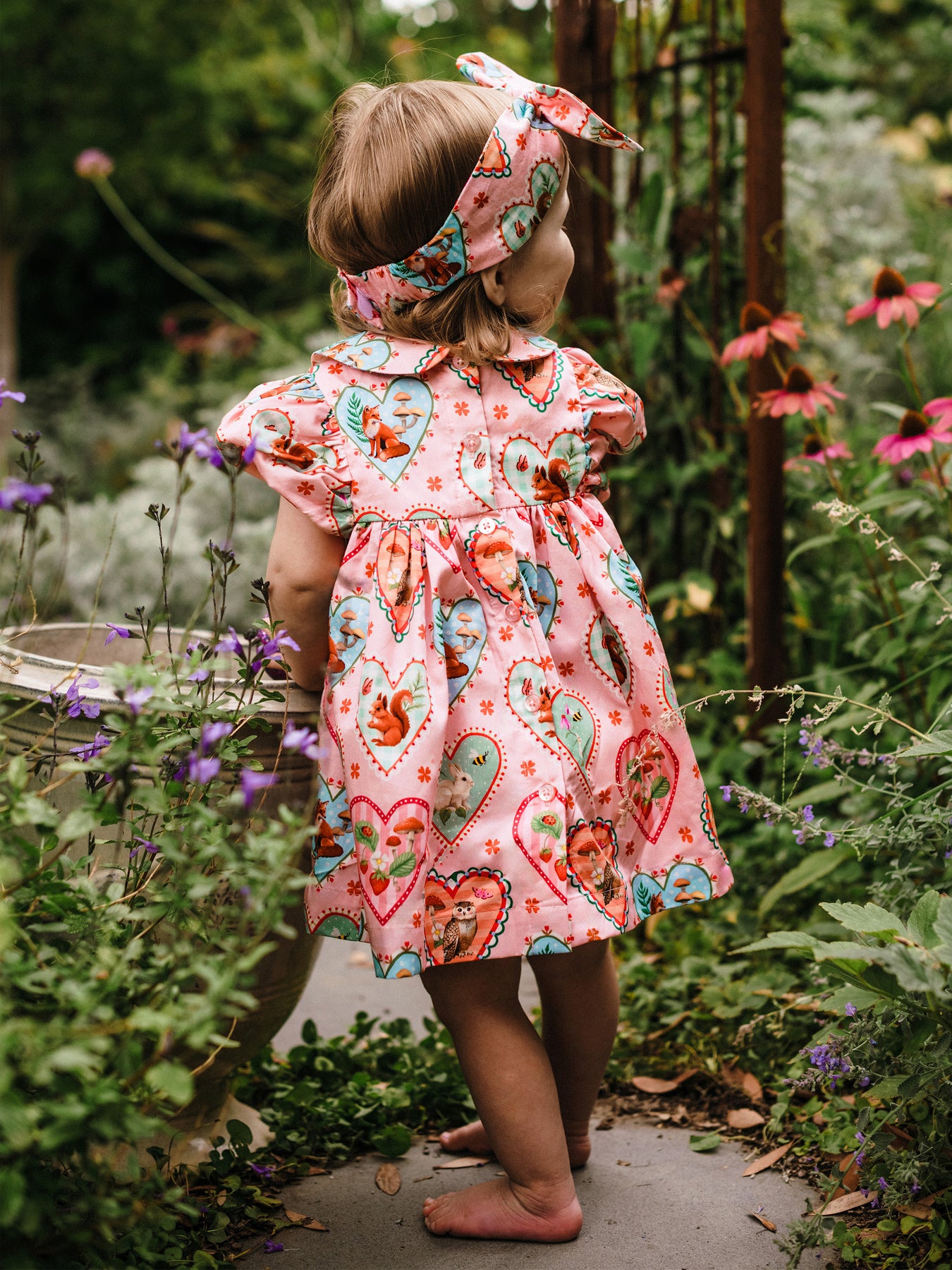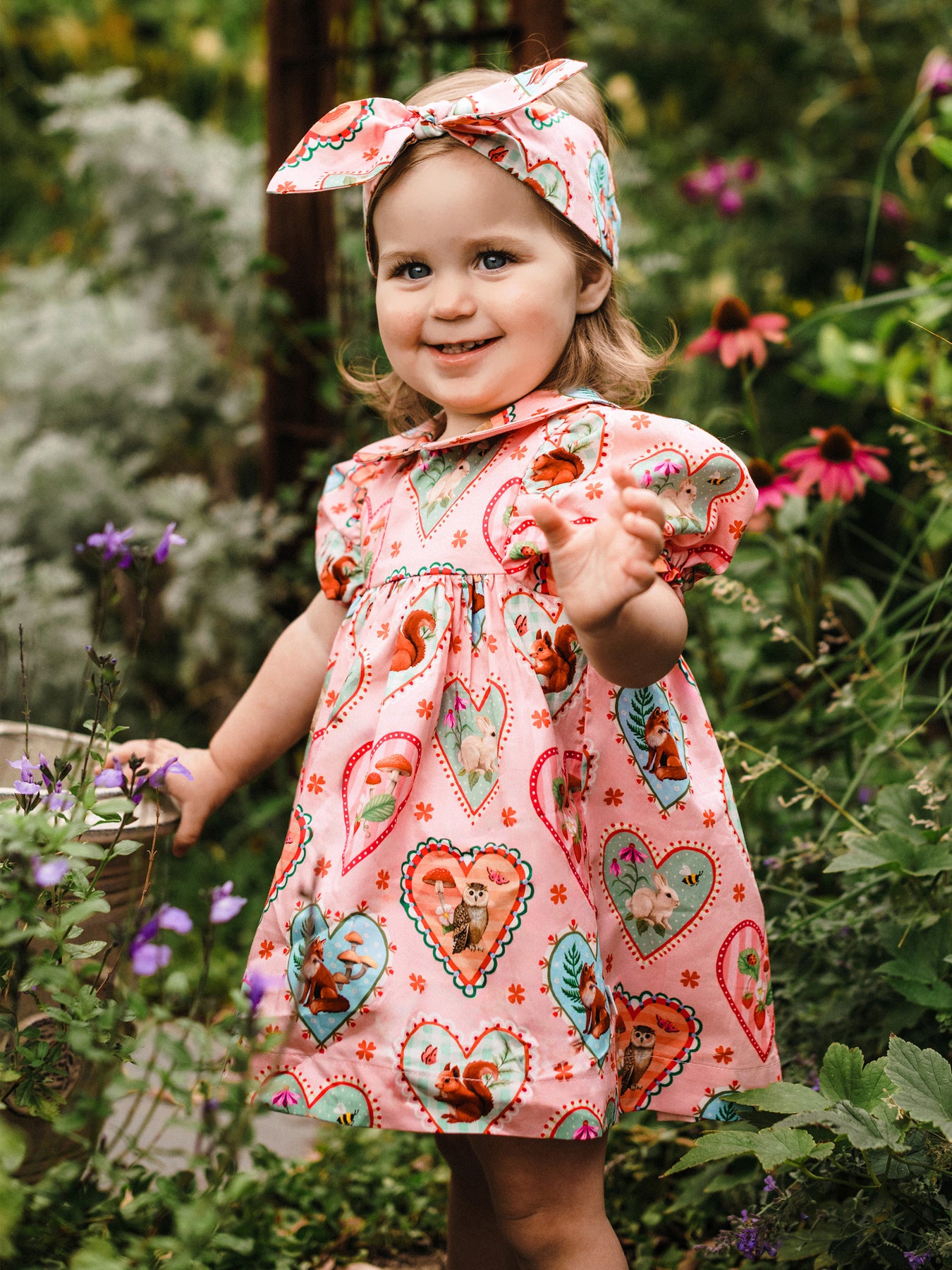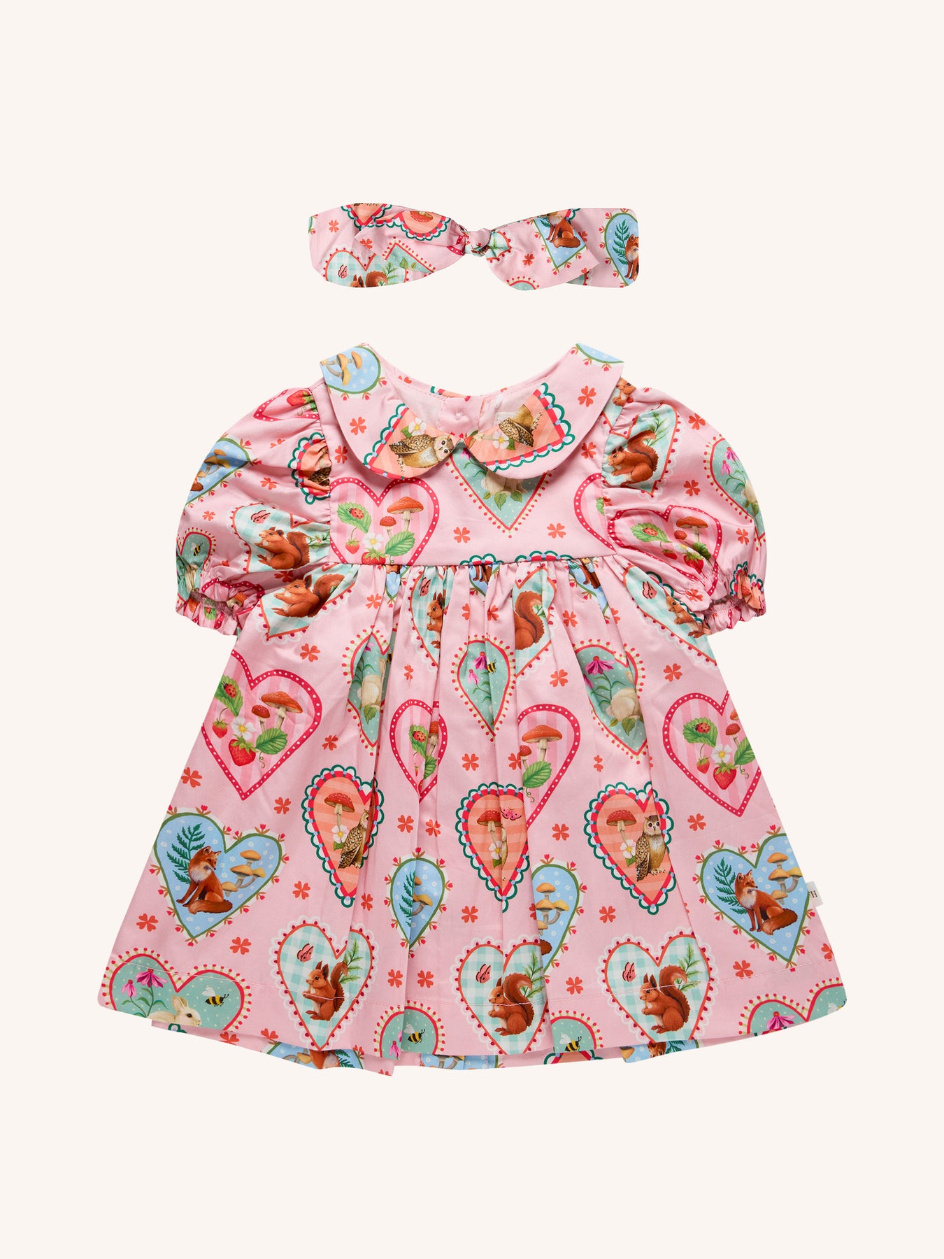 Delightful and dreamy, the 'Woodland Love' Divine Dress and Headband Set – Peach brings storybook charm to every little adventure. Made from soft cotton sateen, the set features a sweet Peter Pan collar, gathered skirt and elasticated sleeves for comfort, paired with a matching headband with soft velcro and gentle stretch. Perfect for playdates, parties or twirling through magical days.