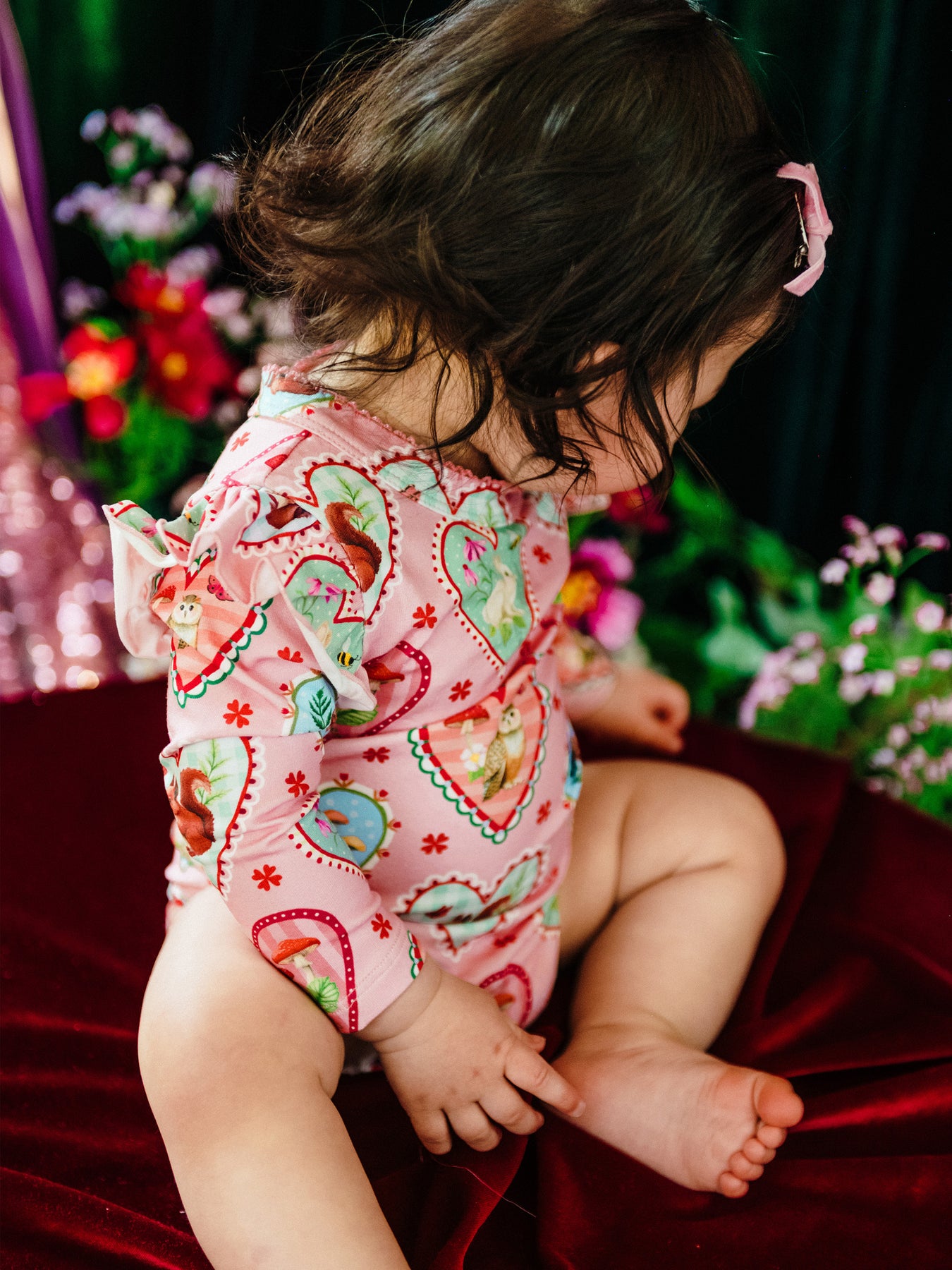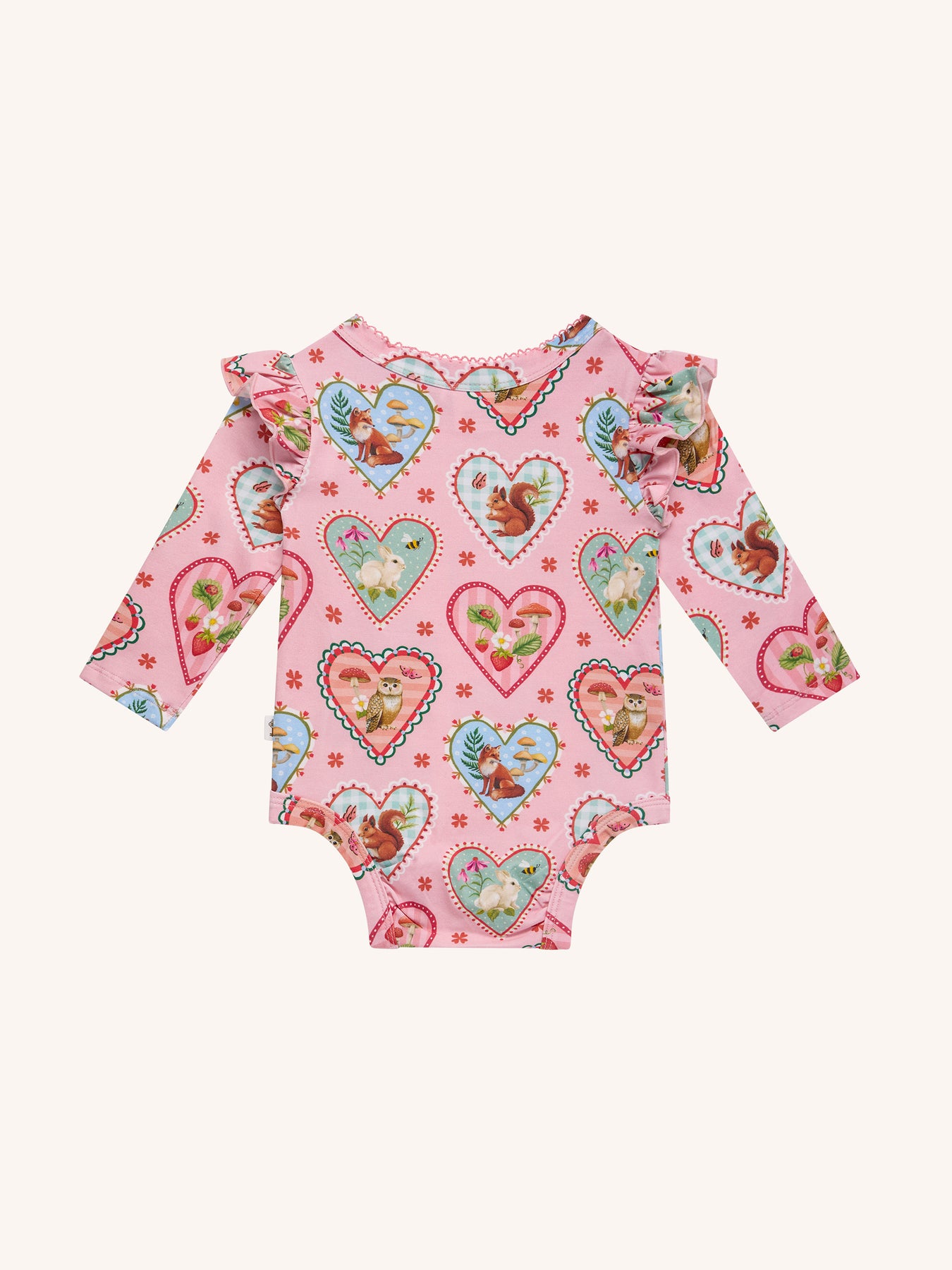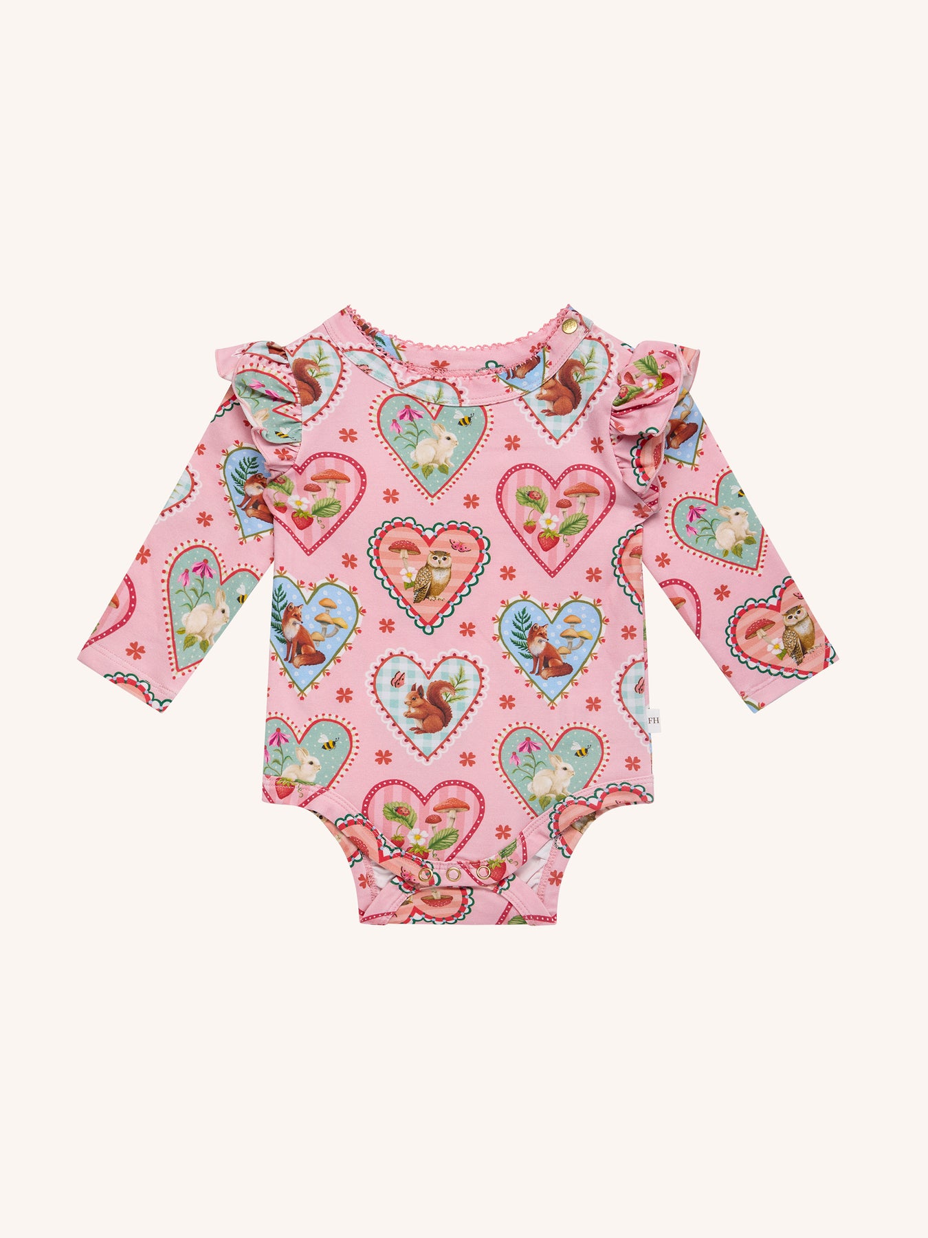 Delight in the ‘Woodland Love’ Frill Bodysuit in Peach from the Fleur Harris 'Days of Enchantment' collection. Crafted from soft cotton elastane jersey adorned with Fleur's printed artwork, it features a sweet picot trim at the neckline, gathered frill atop long sleeves, and gold snaps at the side neck and crotch for easy dressing and nappy changes. Ideal for layering under leggings for whimsical outfits.