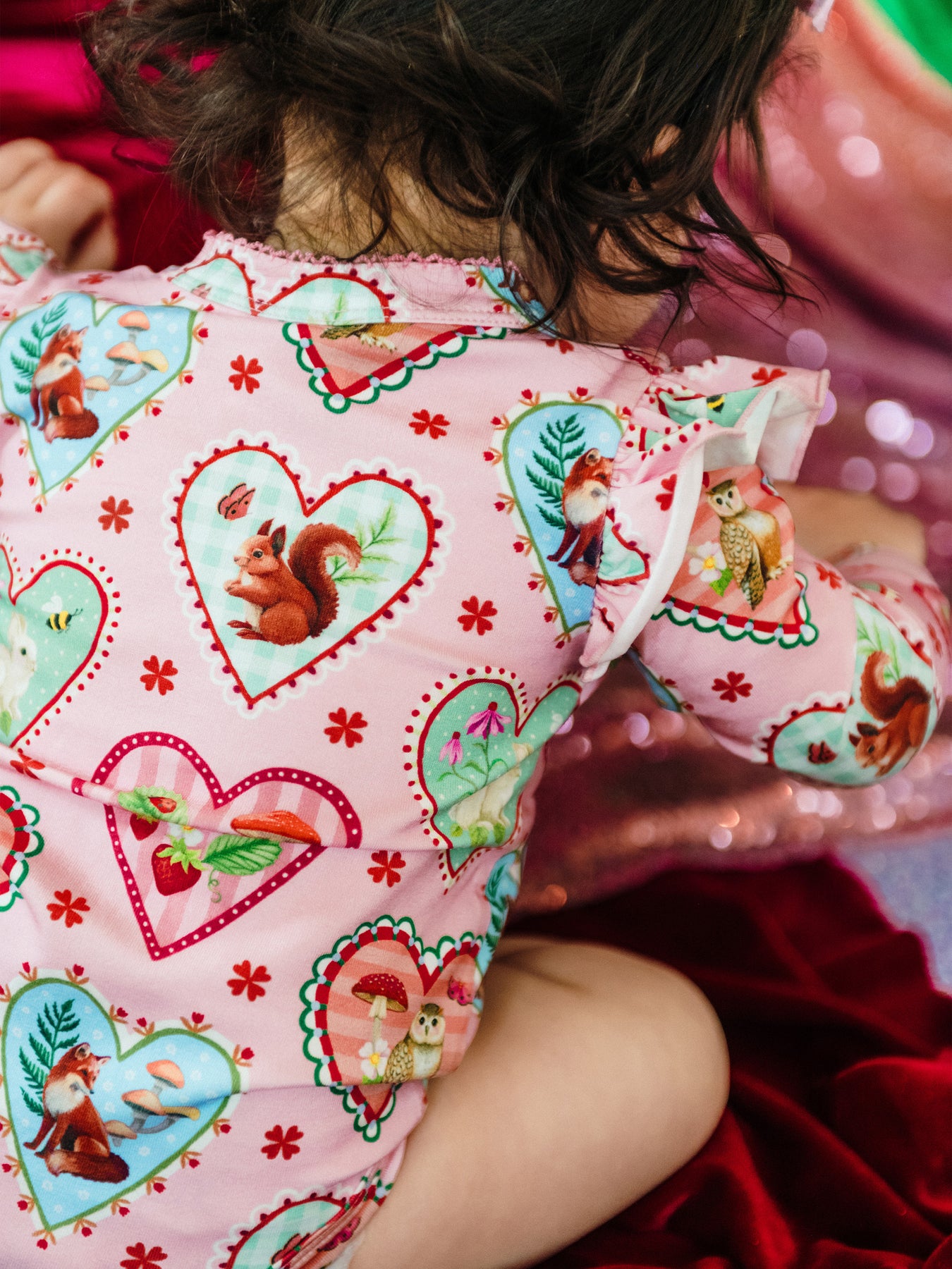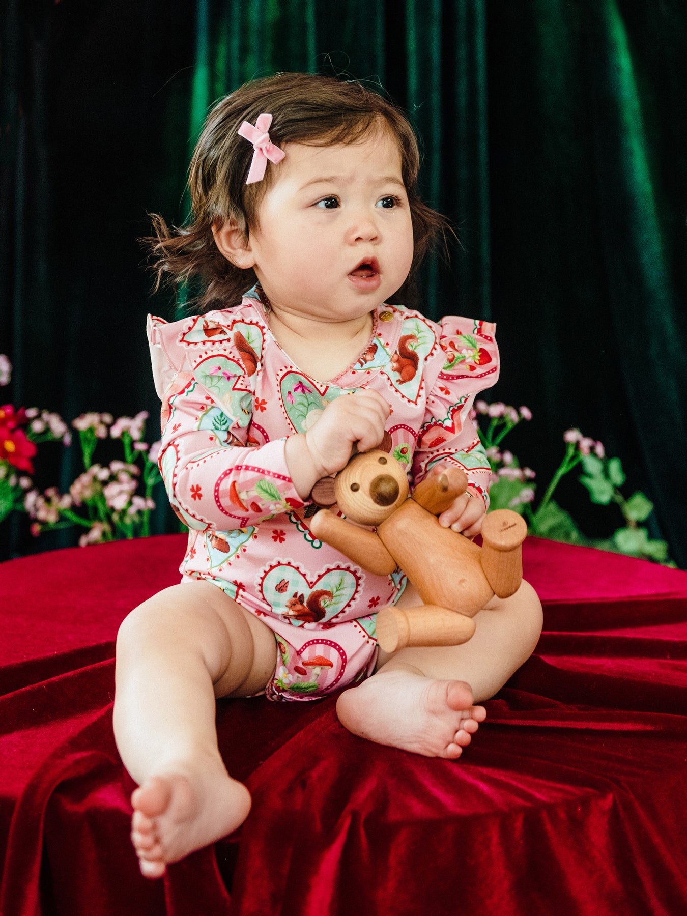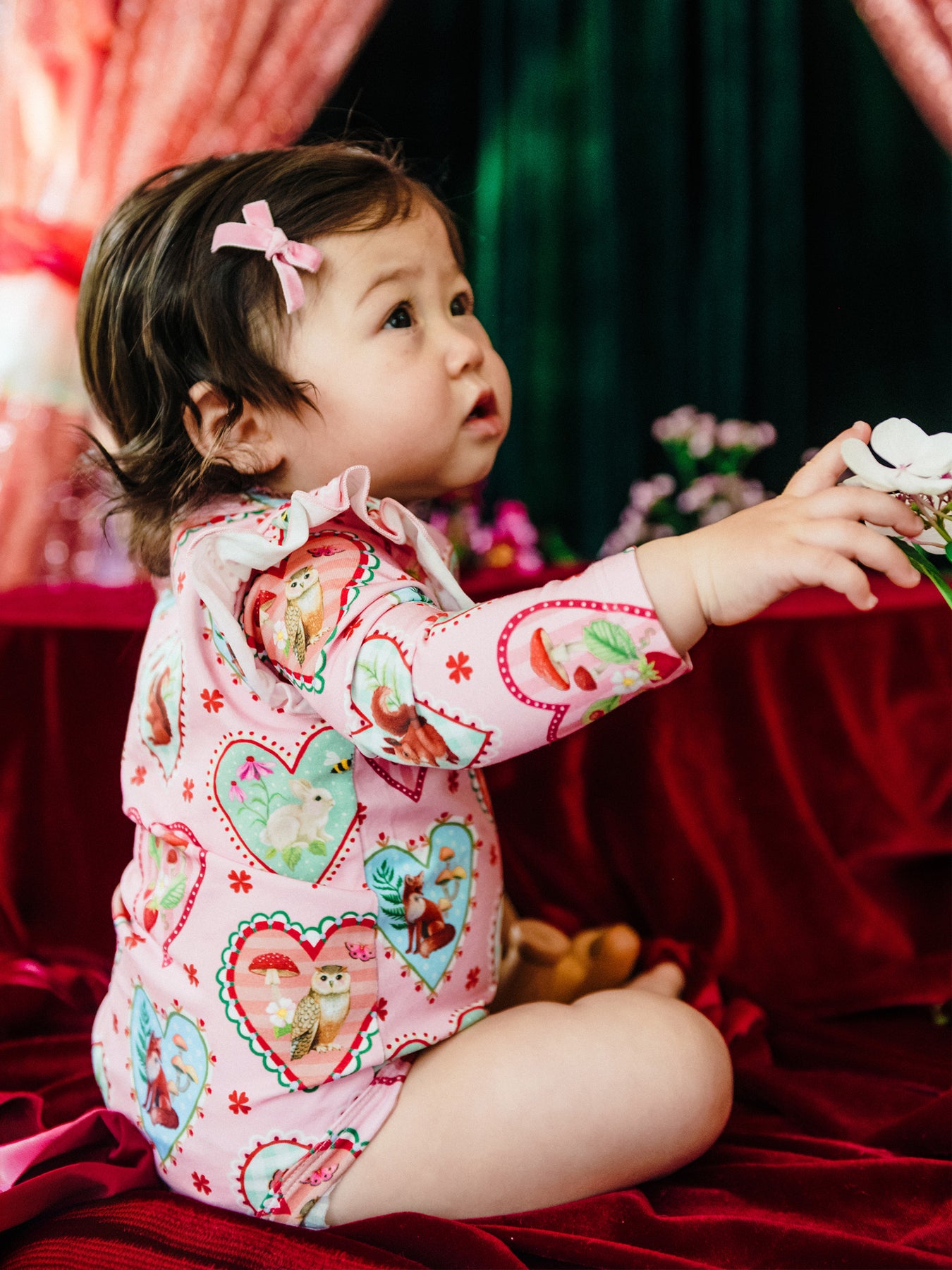 Delight in the ‘Woodland Love’ Frill Bodysuit in Peach from the Fleur Harris 'Days of Enchantment' collection. Crafted from soft cotton elastane jersey adorned with Fleur's printed artwork, it features a sweet picot trim at the neckline, gathered frill atop long sleeves, and gold snaps at the side neck and crotch for easy dressing and nappy changes. Ideal for layering under leggings for whimsical outfits.