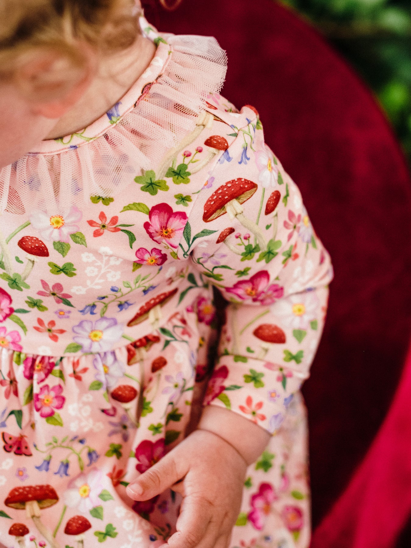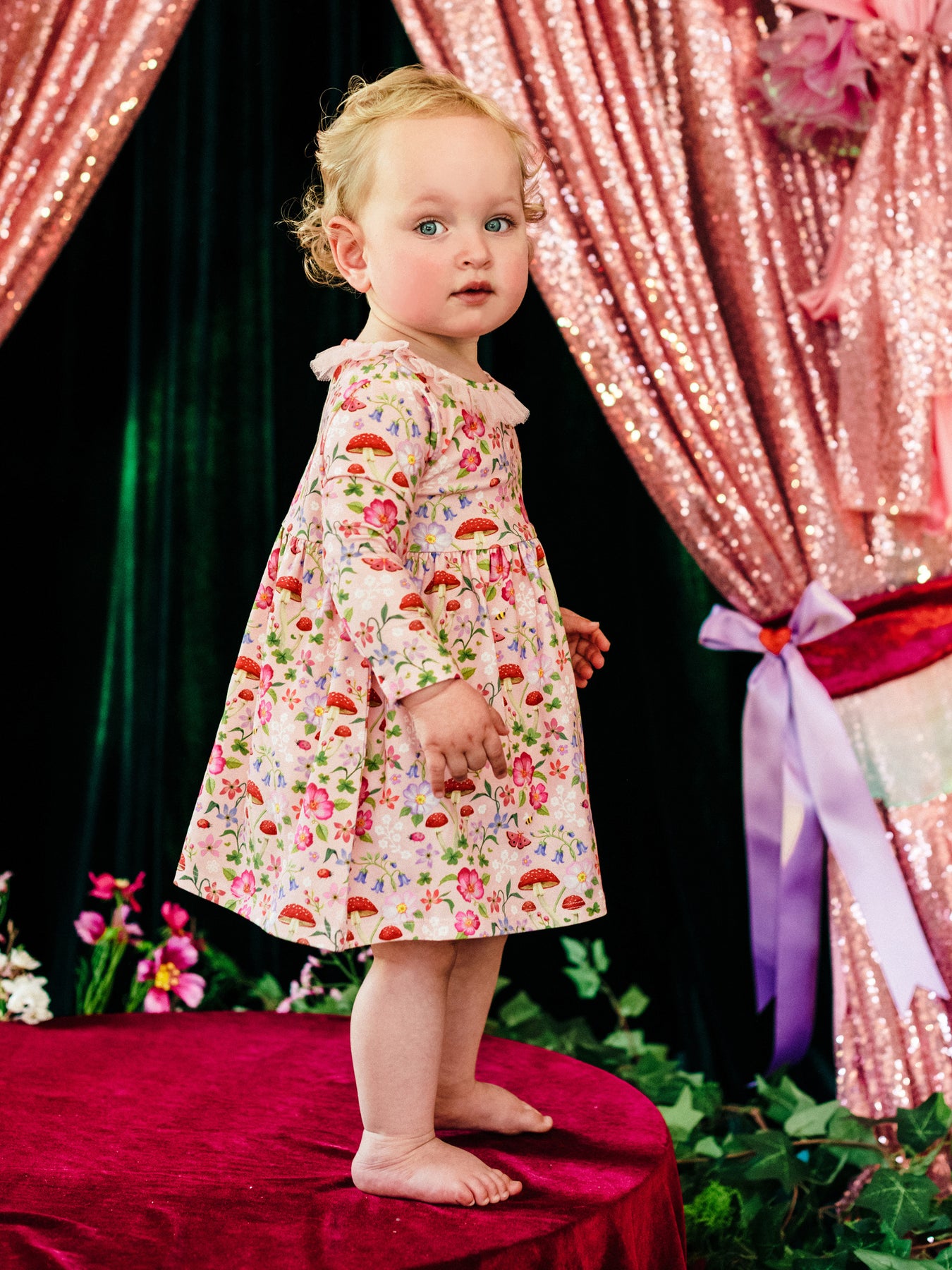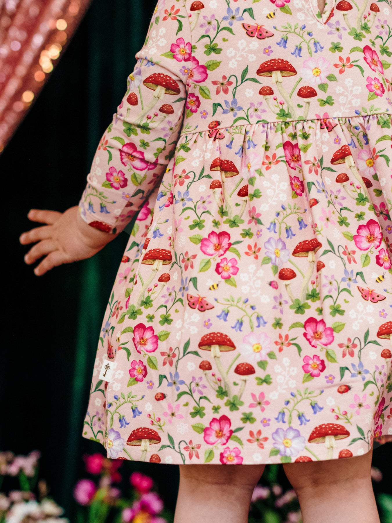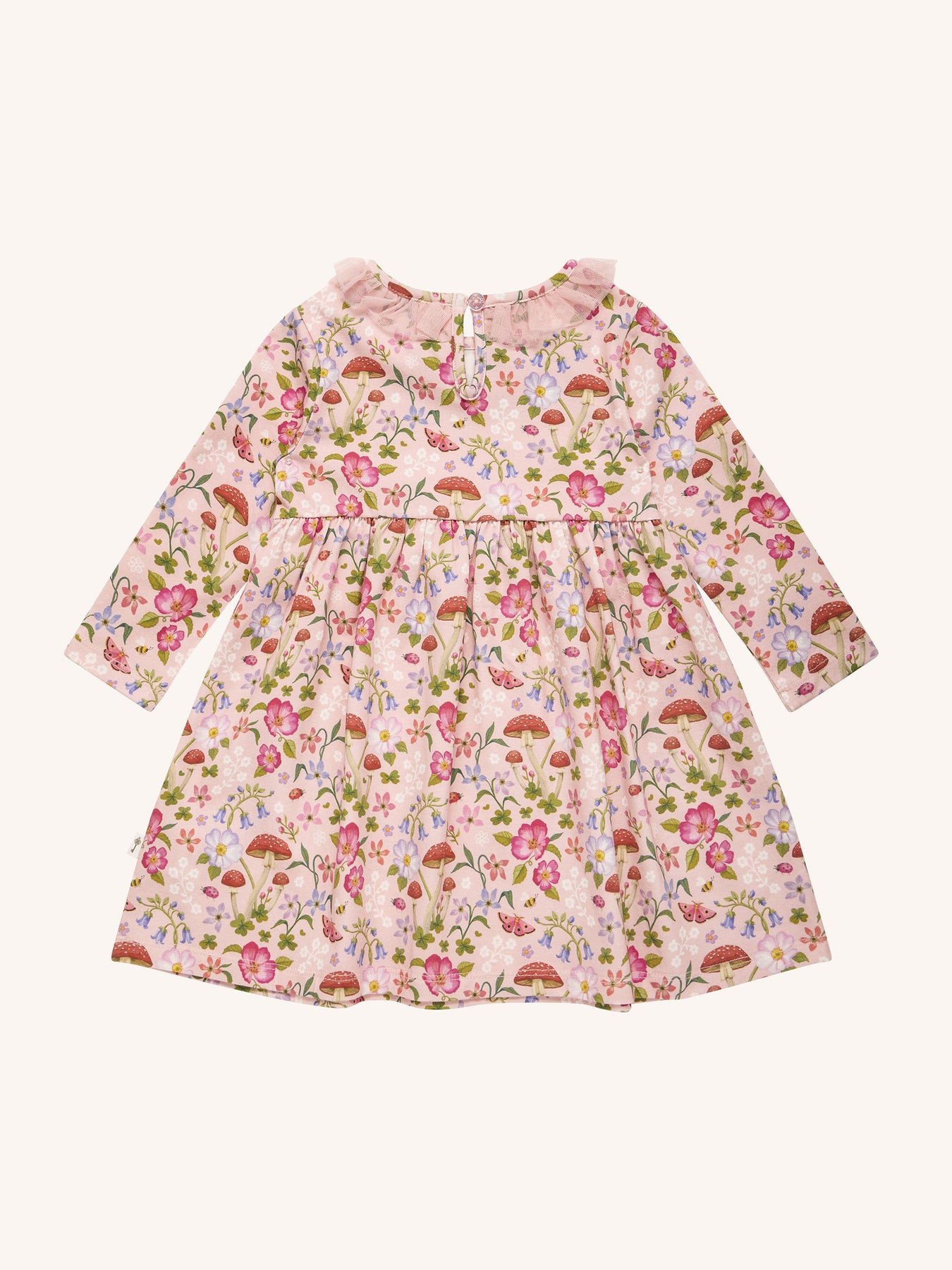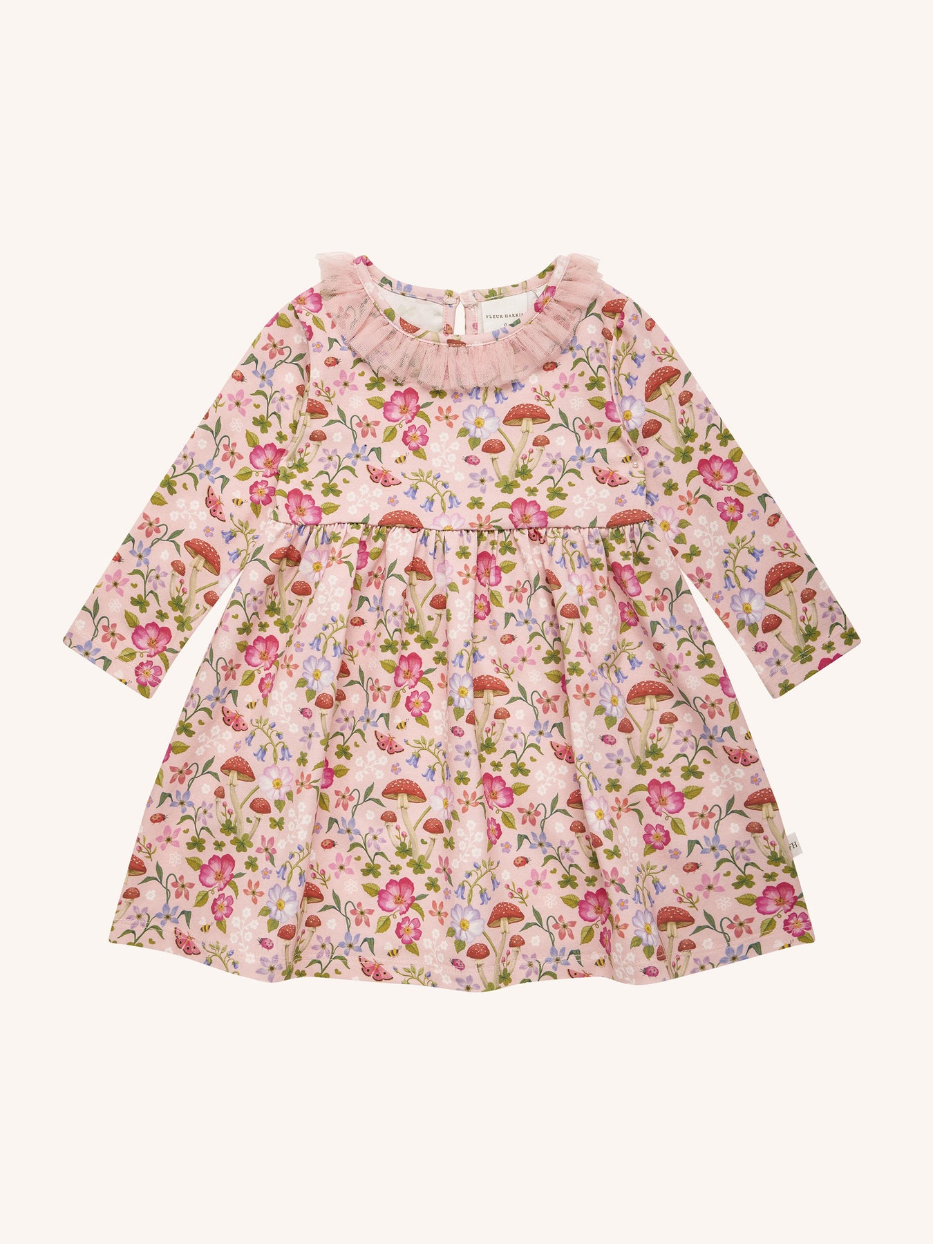 The ‘Toadstool' Paradise Dress in Apricot from the Fleur Harris 'Days of Enchantment' collection adds a charming, whimsical touch to their wardrobe. Featuring a cotton elastane jersey bodice with printed artwork, long sleeves, gathered neck frill, and a gathered skirt with frill detailing at the neckline, this dress includes a back button opening for easy dressing. Perfect for playful days or special occasions, it pairs beautifully with other pieces from the collection.