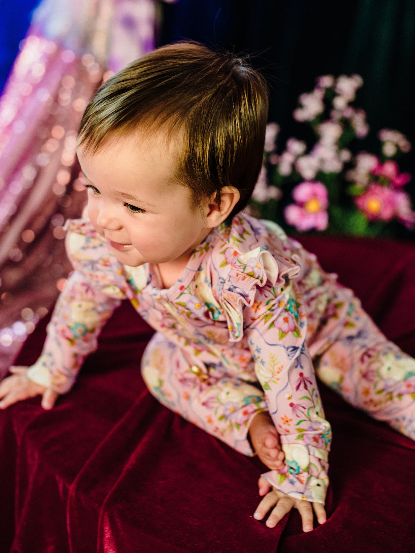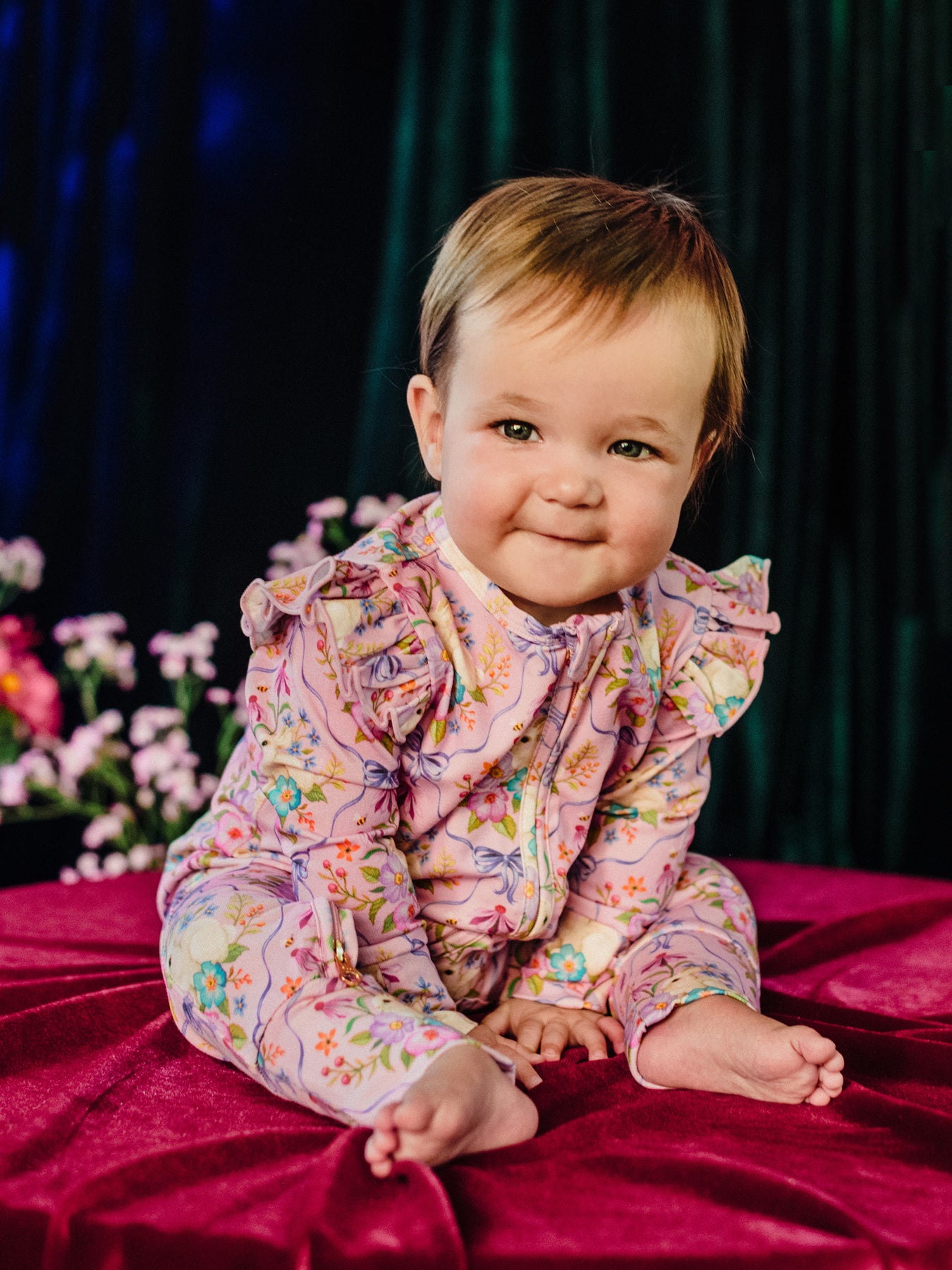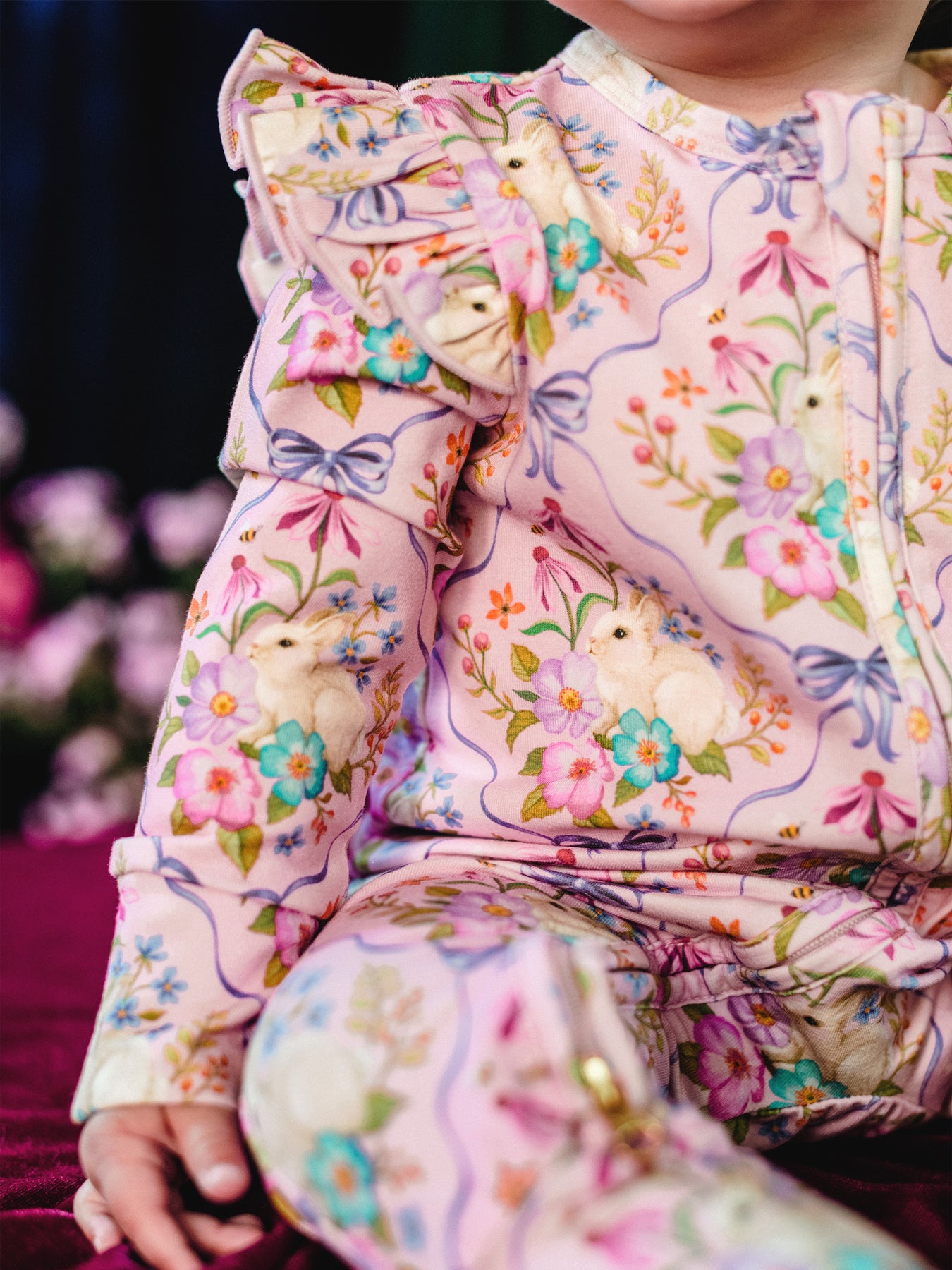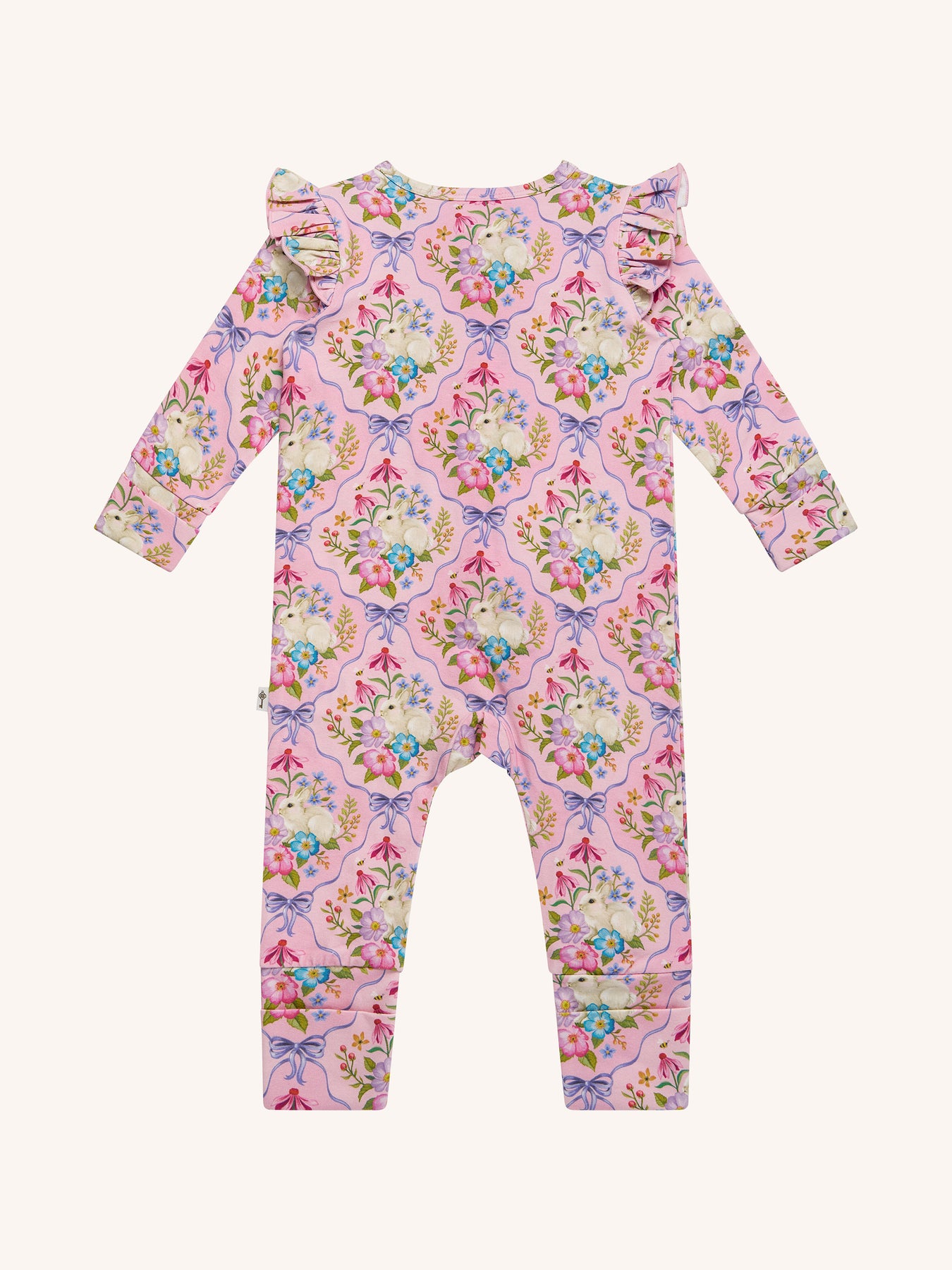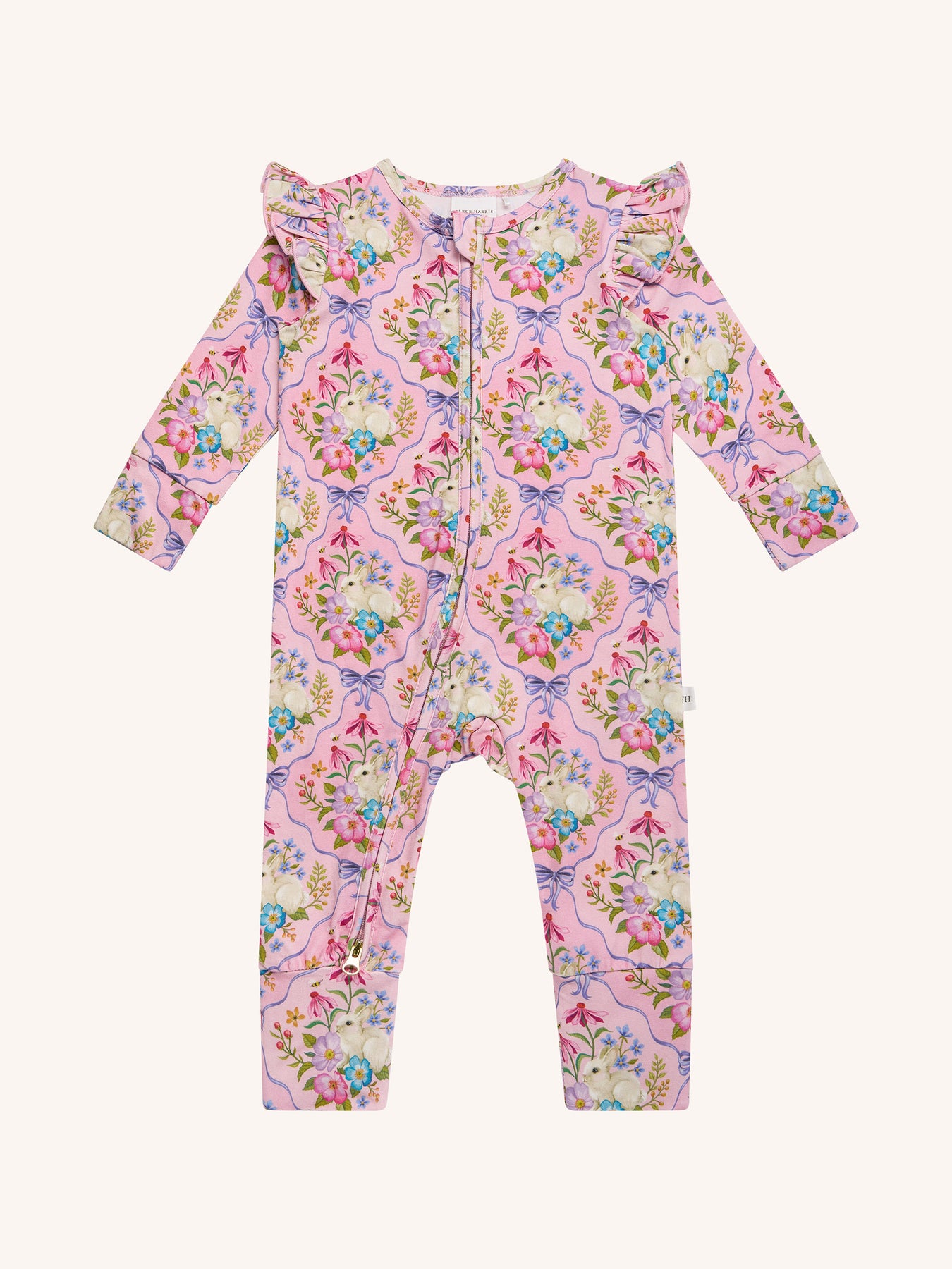 The ‘Bunnies & Bows’ Precious Frill Coverall in Pink Love from the Fleur Harris 'Days of Enchantment' collection is a sweet and cosy layer for your little one. Crafted from soft cotton elastane jersey with printed artwork, it features gathered frill sleeves, fold-over cuffs, and a 2-way zip with gold zip pulls for easy dressing and nappy changes. Perfect for playtime or layering under jackets, it combines comfort with whimsical style.