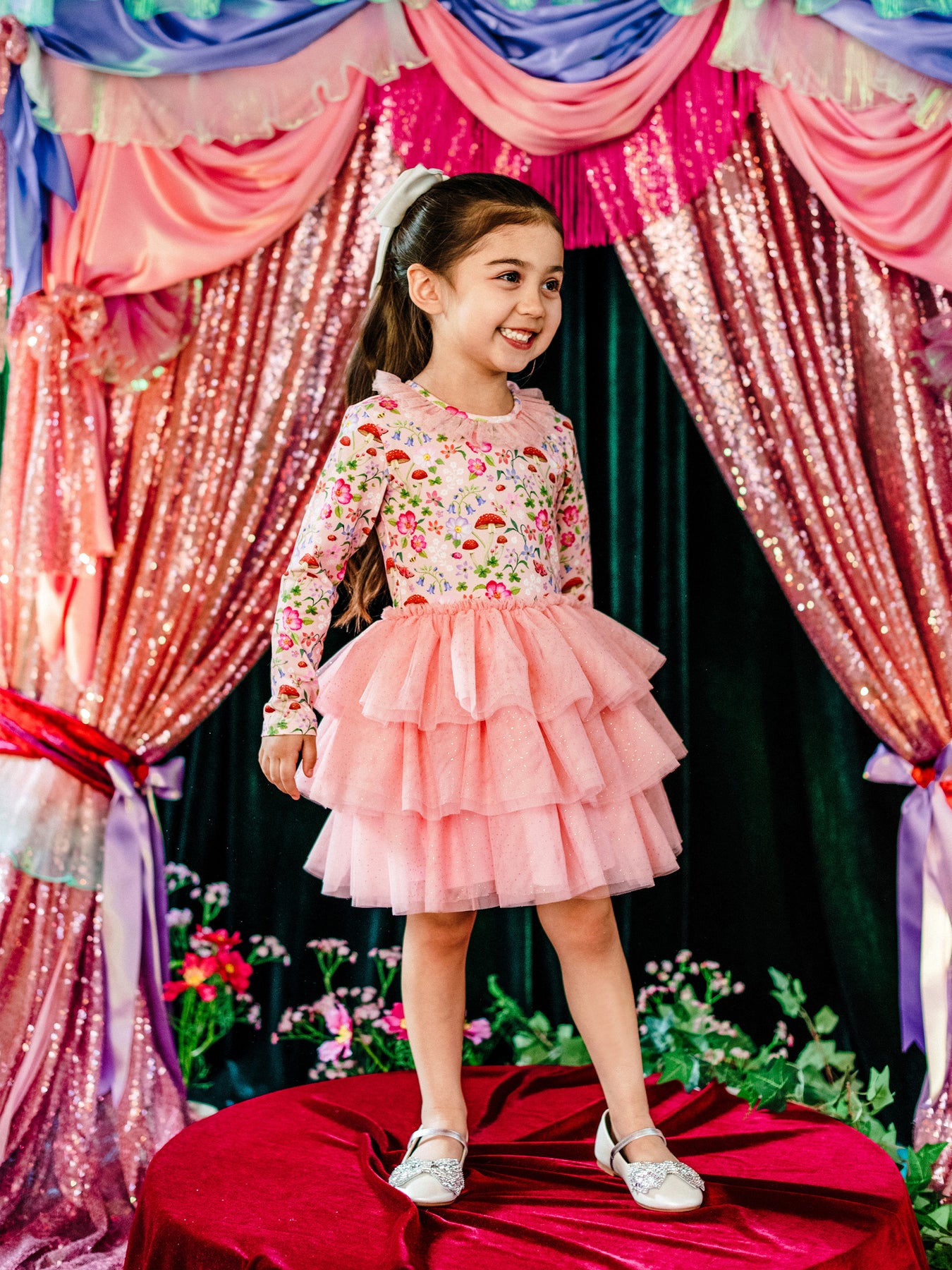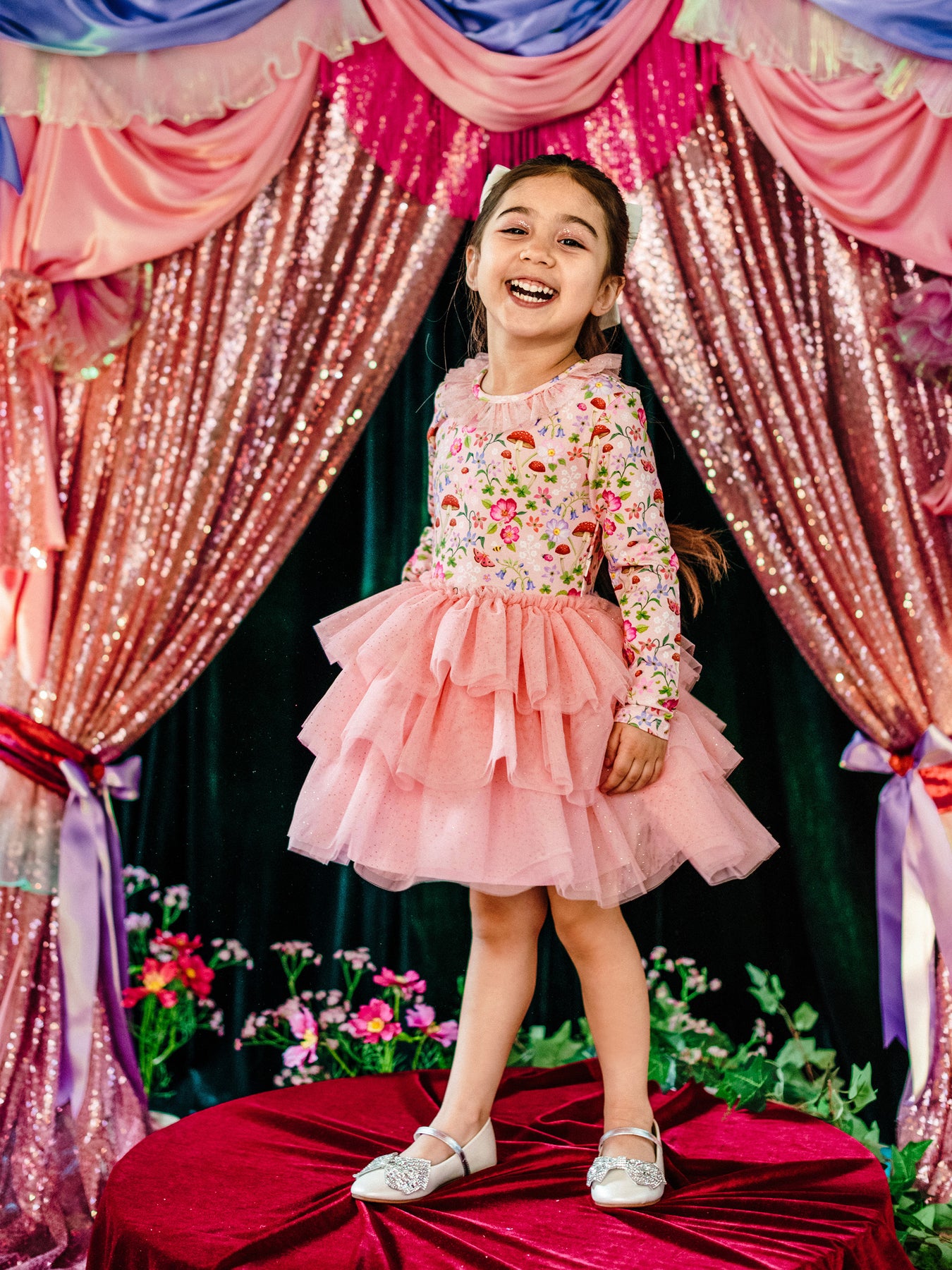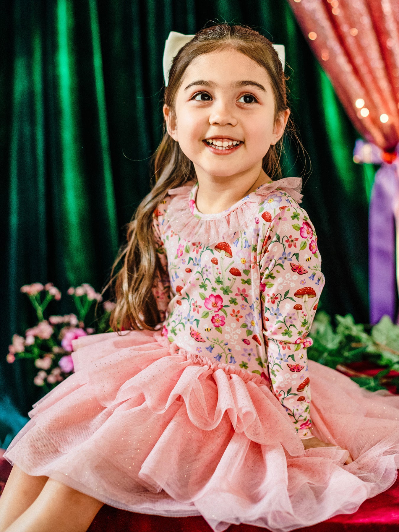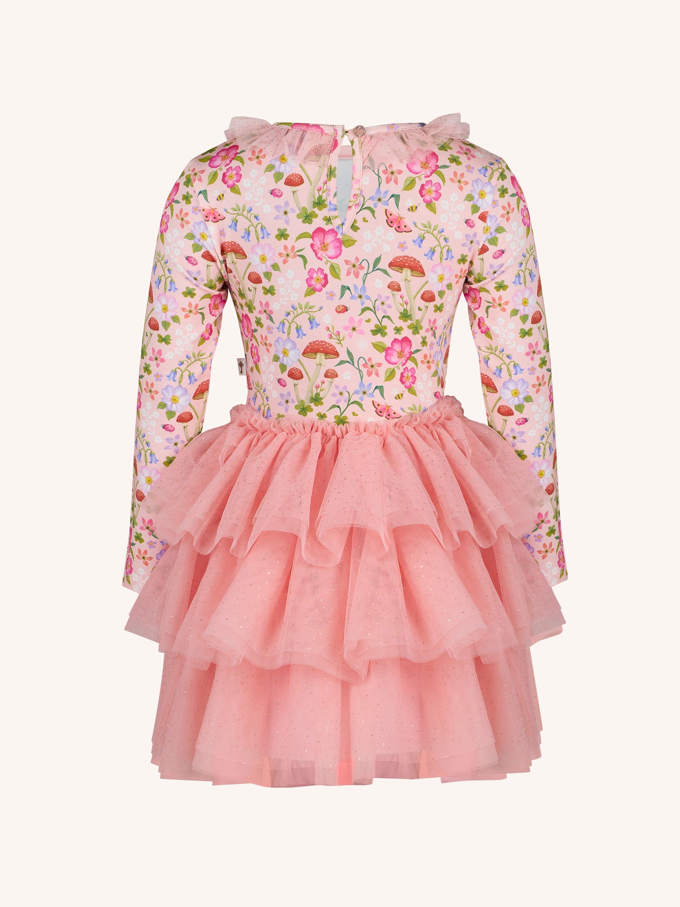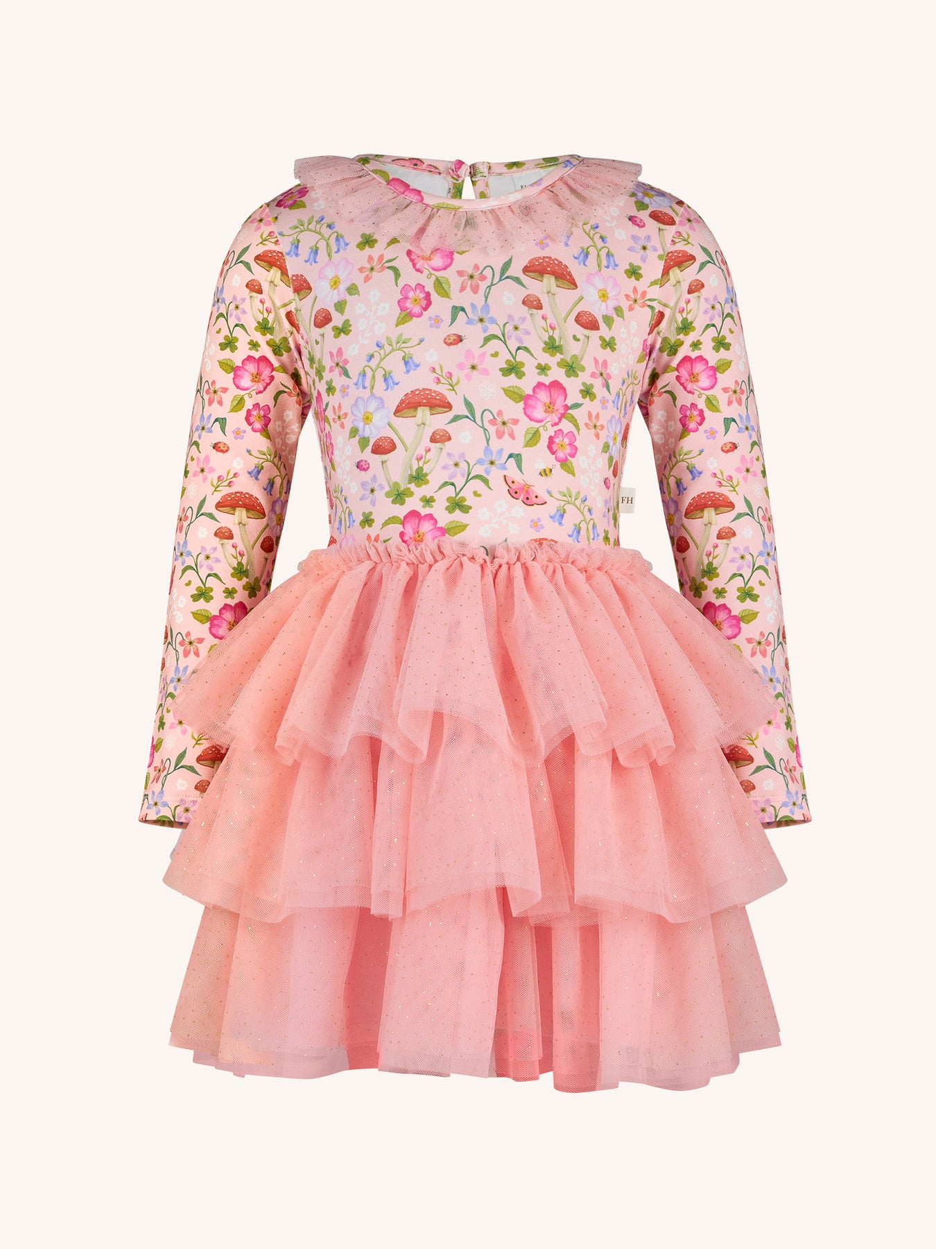The ‘Toadstool' Rosy Tutu Dress in Apricot from the Fleur Harris 'Days of Enchantment' collection adds a whimsical touch to your little one's wardrobe. Featuring a cotton elastane jersey bodice with printed artwork, a soft sparkling tulle skirt and neck frill, and a gathered frill at the neckline, this dress includes a keyhole neck opening at the back for easy dressing. Perfect for playful days or special occasions, it pairs beautifully with other pieces from the collection.