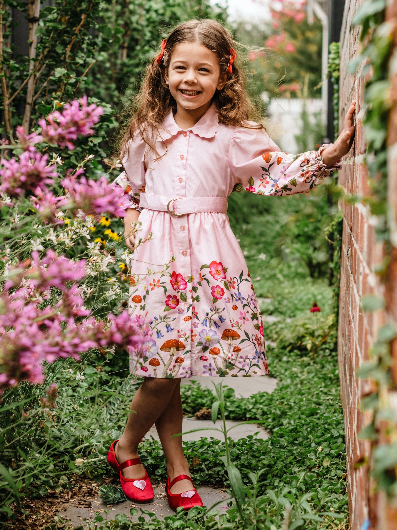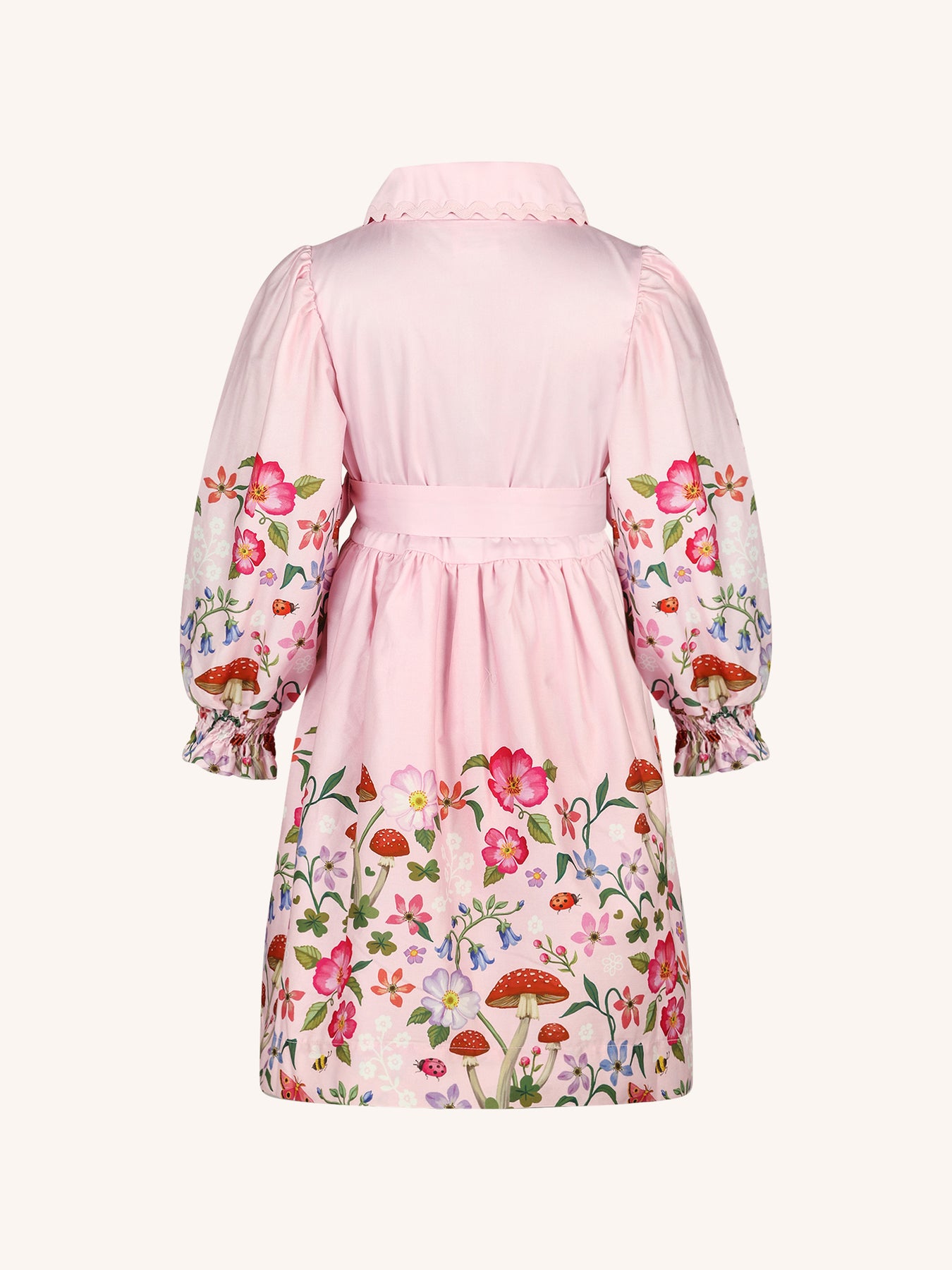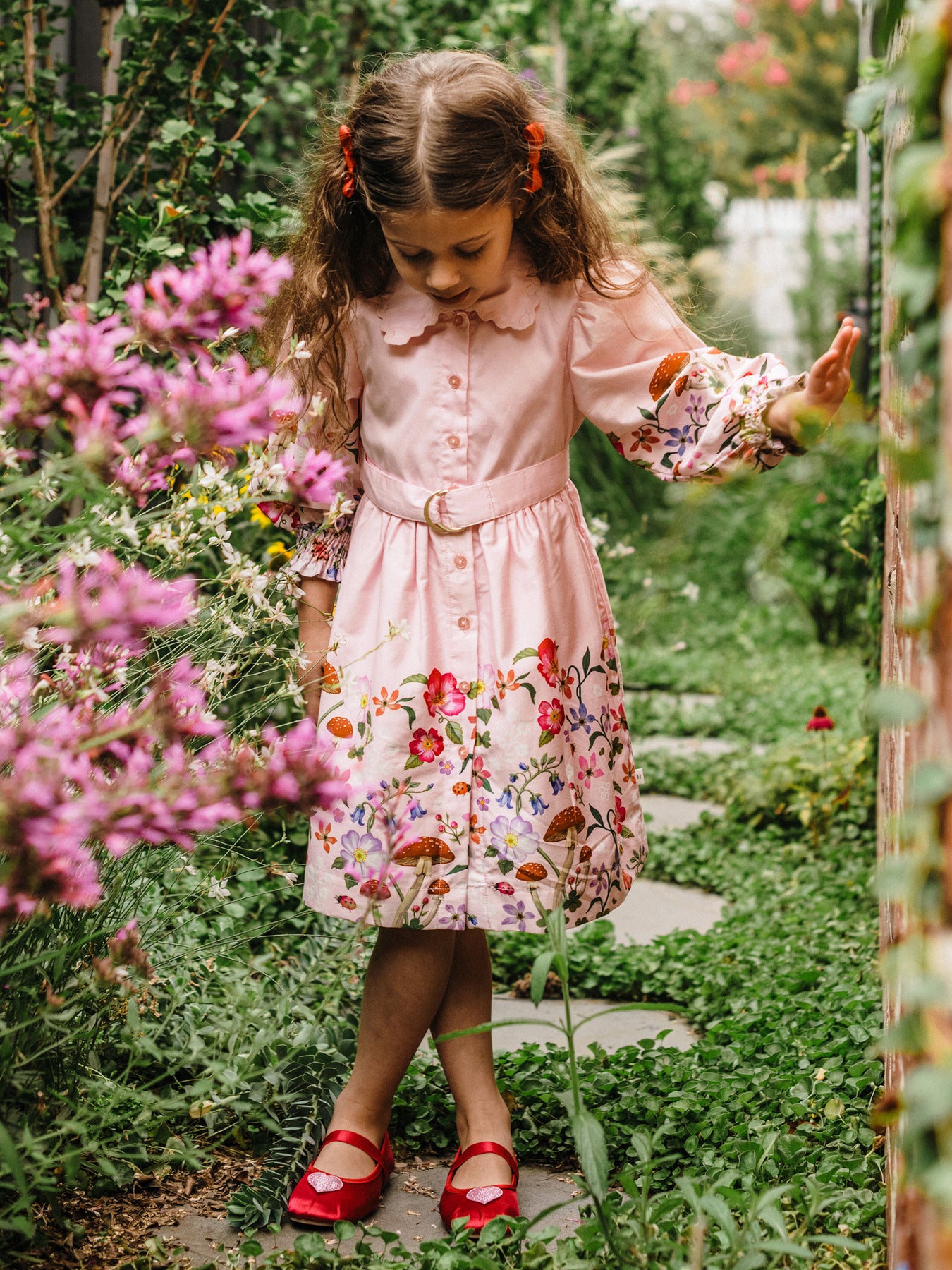 The ‘Toadstool' Border Serene Shirt Dress in Peach from the Fleur Harris 'Days of Enchantment' collection combines comfort with whimsical charm. Crafted from soft cotton sateen with a printed border design, this shirt-style dress features a ric rac-trimmed collar, shirred cuffs, front placket buttons, and a self-fabric slide belt with buckle. Ideal for everyday wear or special occasions, it pairs beautifully with other pieces from the collection for a delightful look.