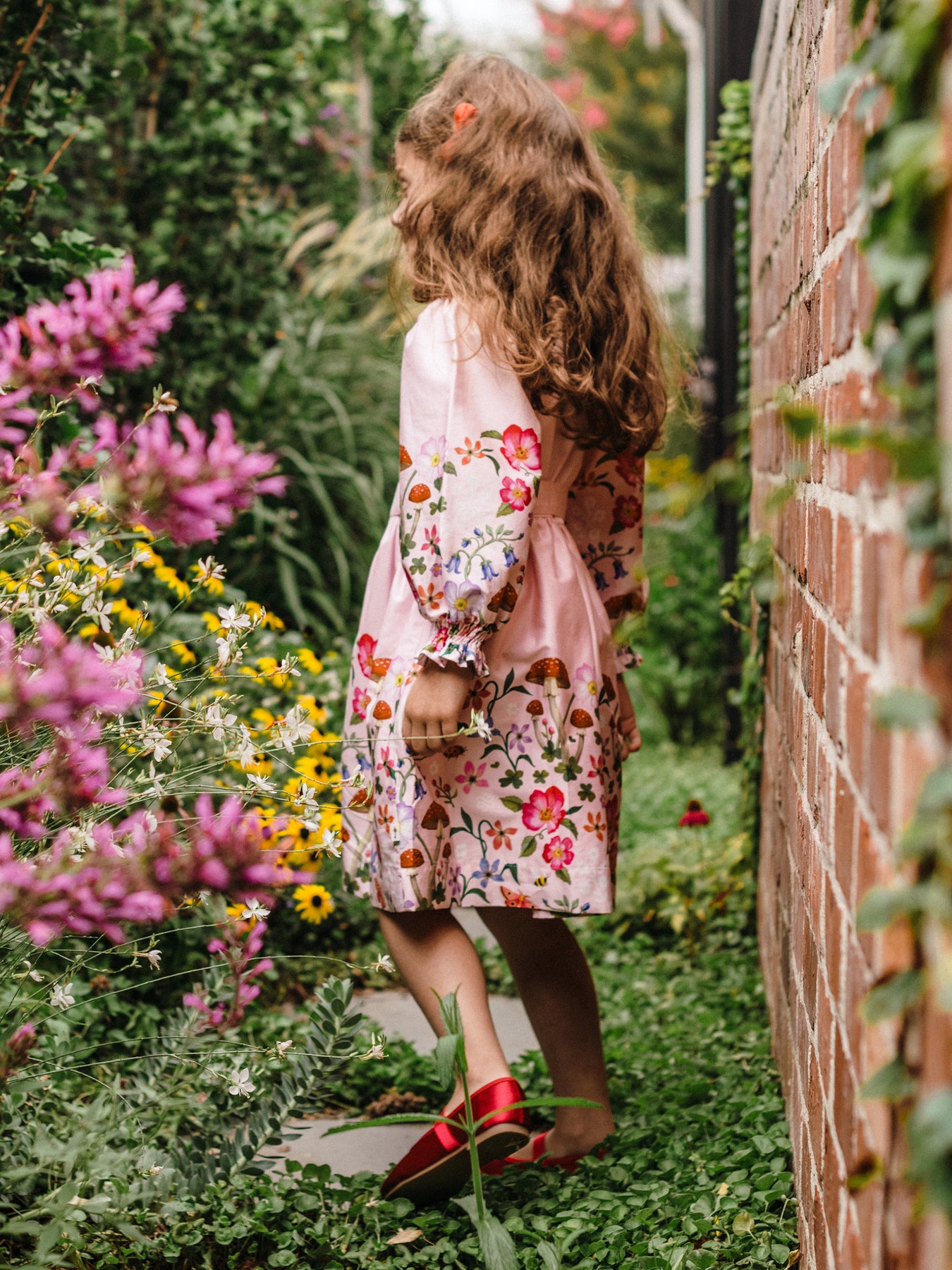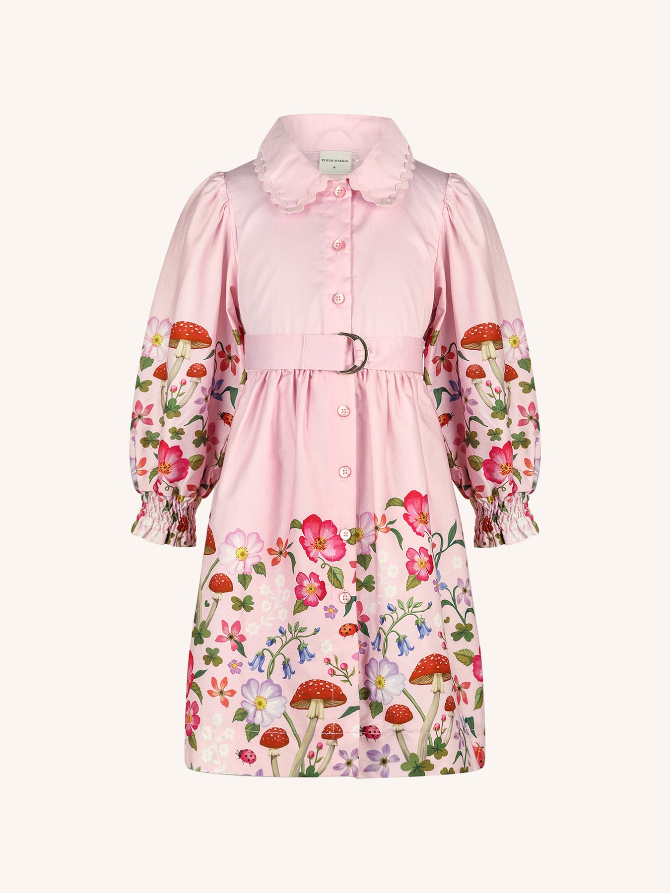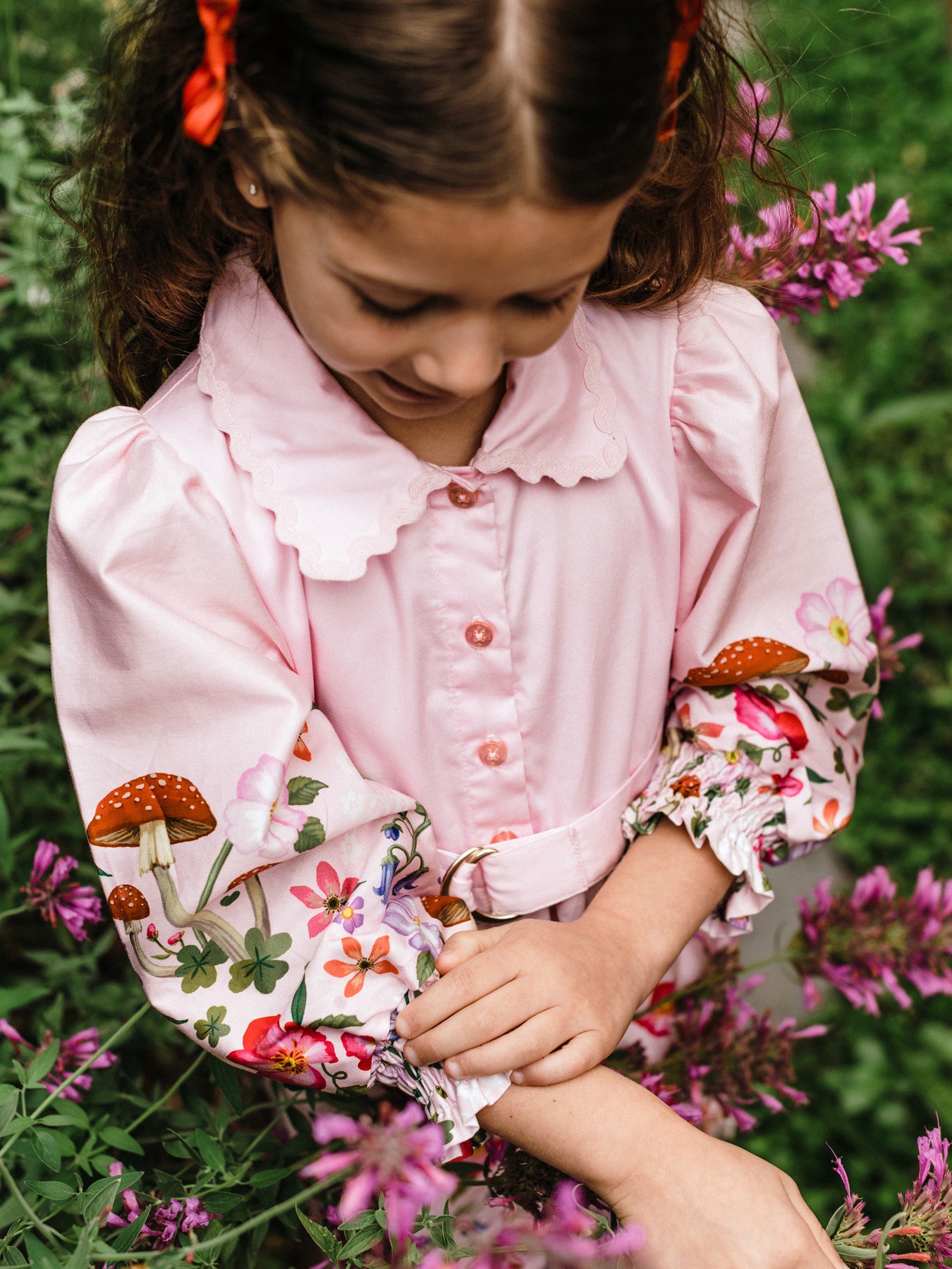 The ‘Toadstool' Border Serene Shirt Dress in Peach from the Fleur Harris 'Days of Enchantment' collection combines comfort with whimsical charm. Crafted from soft cotton sateen with a printed border design, this shirt-style dress features a ric rac-trimmed collar, shirred cuffs, front placket buttons, and a self-fabric slide belt with buckle. Ideal for everyday wear or special occasions, it pairs beautifully with other pieces from the collection for a delightful look.
