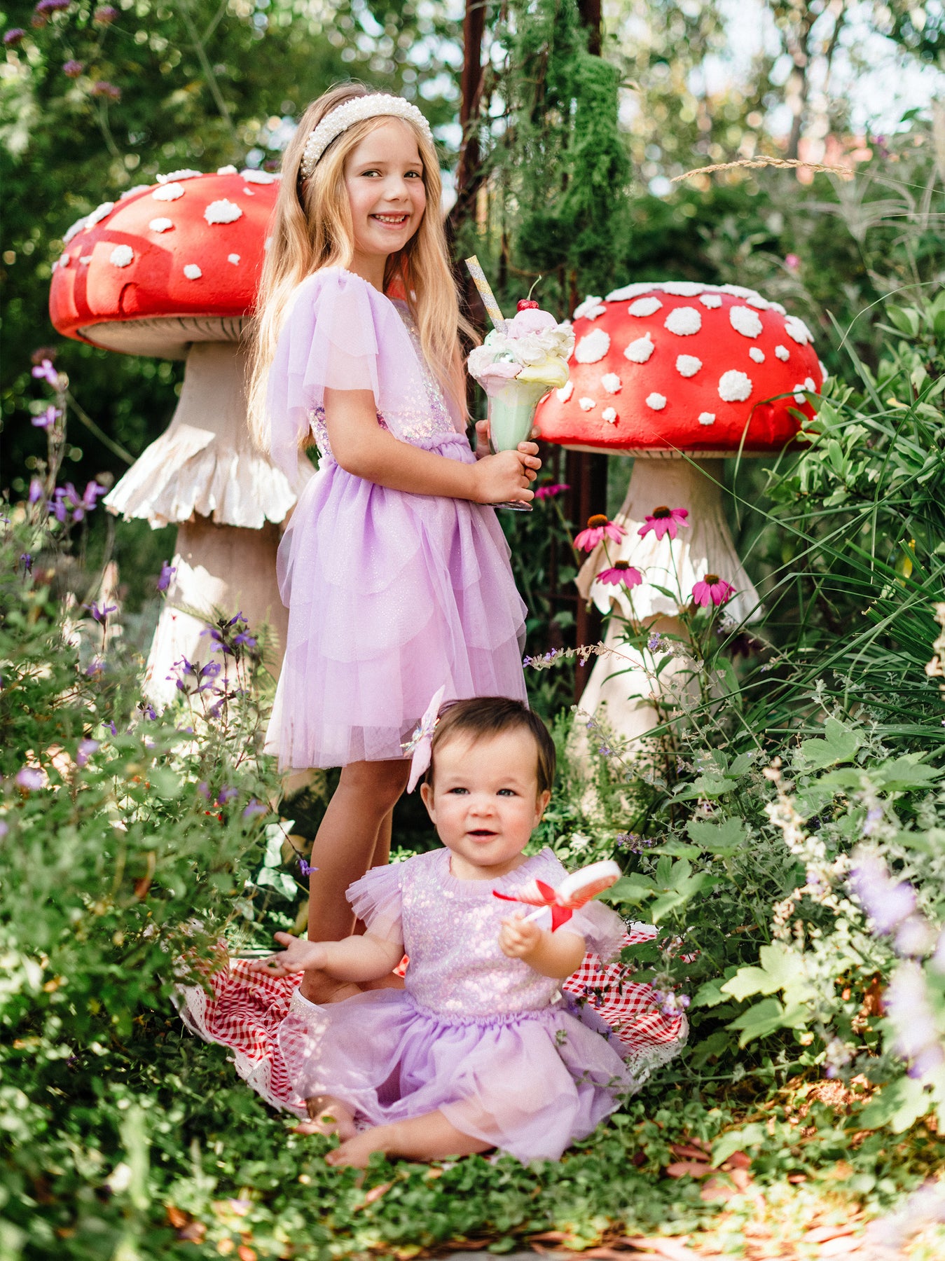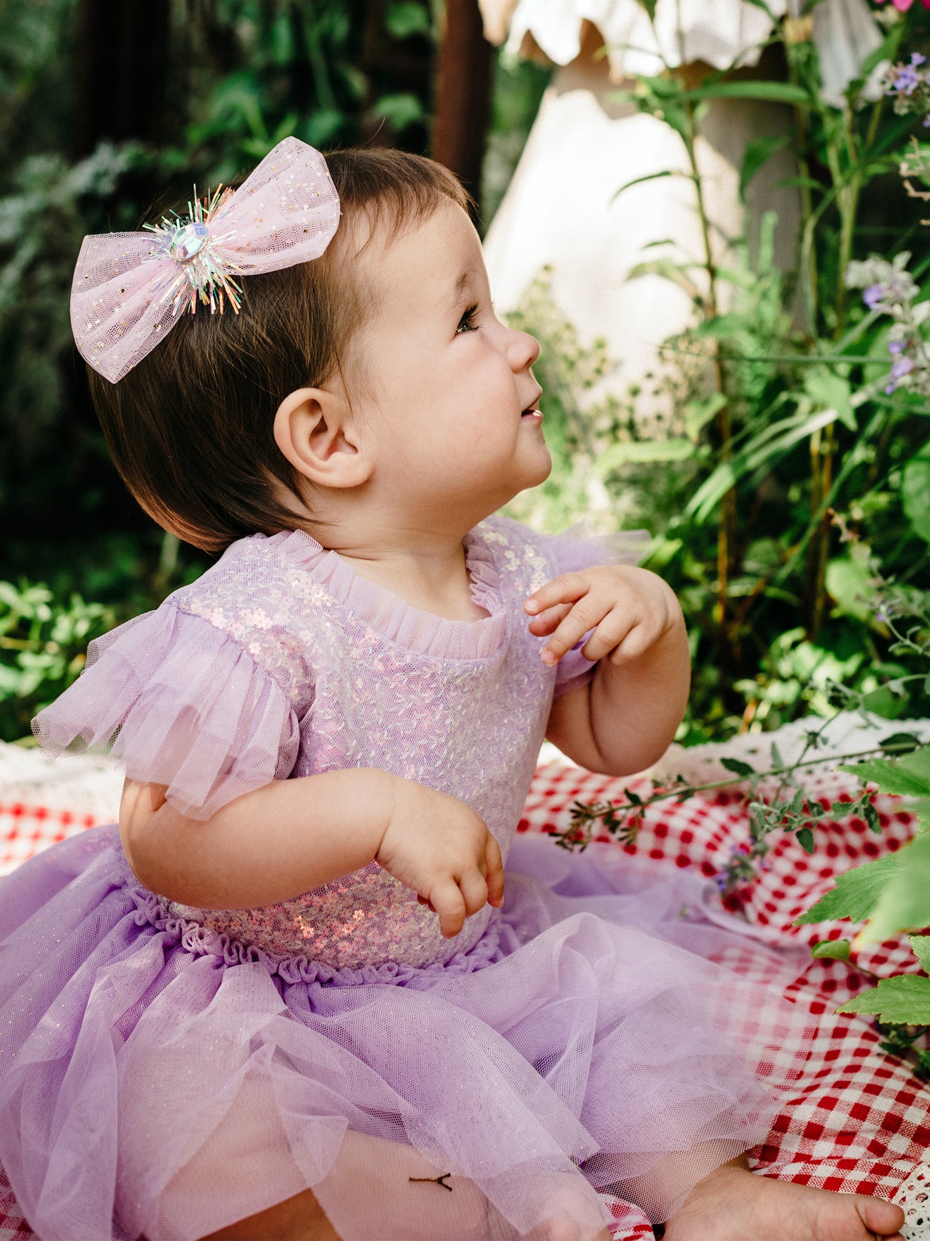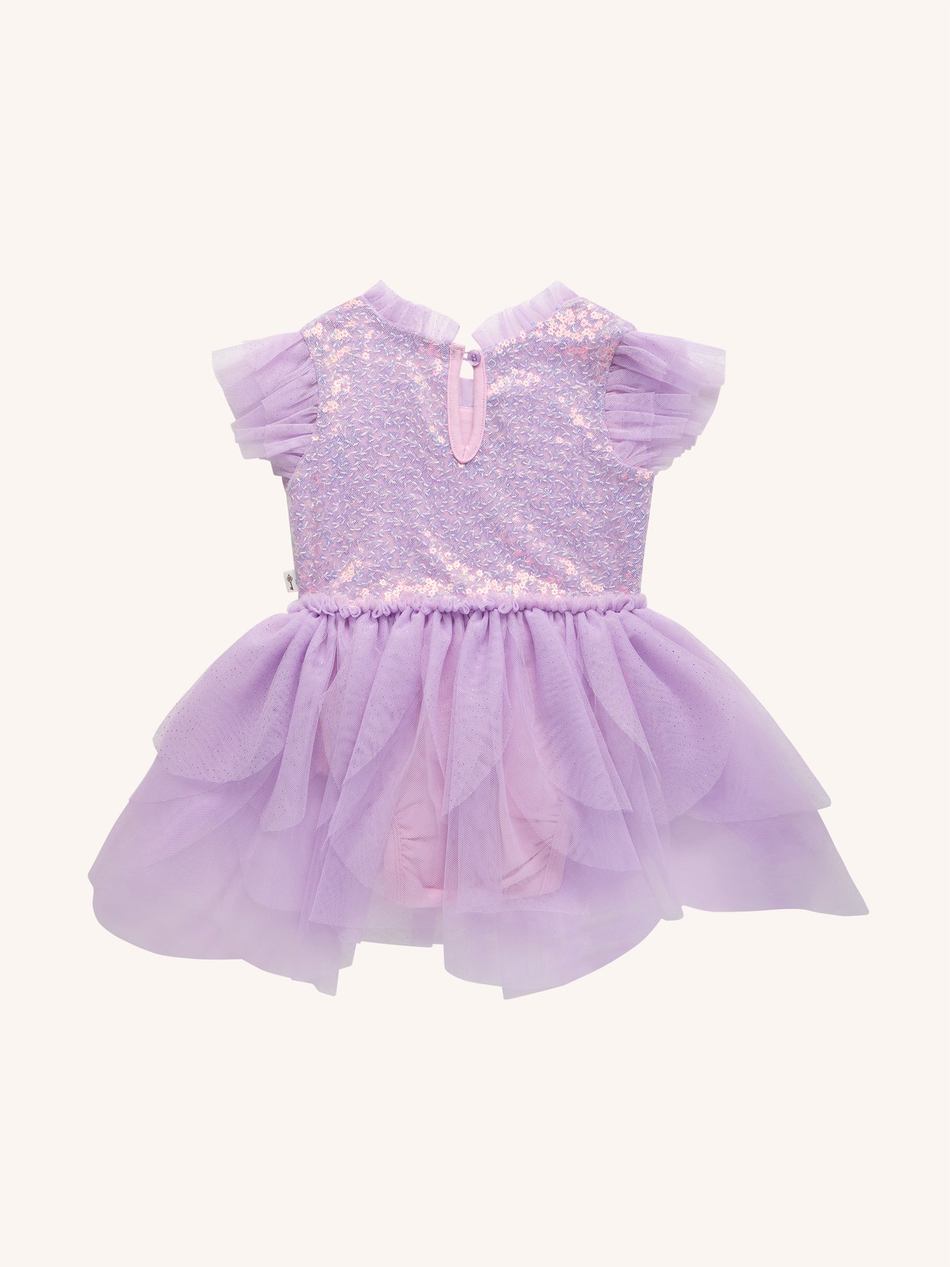 Let little imaginations soar with the ‘The Magic Faraway Tree’ Sequin Fairy Dress Baby from the Fleur Harris x Enid Blyton 'The Magic Faraway Tree' collection. Crafted from soft cotton elastane jersey with layered tulle and shimmering sequin accents, this enchanting baby and toddler dress features double gathered ruffled frill sleeves, soft petal layers of tonal tulle with gold sparkles, and a centre back keyhole for easy dressing. Finished with the FH and magic key branded pip and a swing tag that doubles as a gift tag, it’s the perfect dress for magical playdates, special occasions, or twirling into storybook adventures.