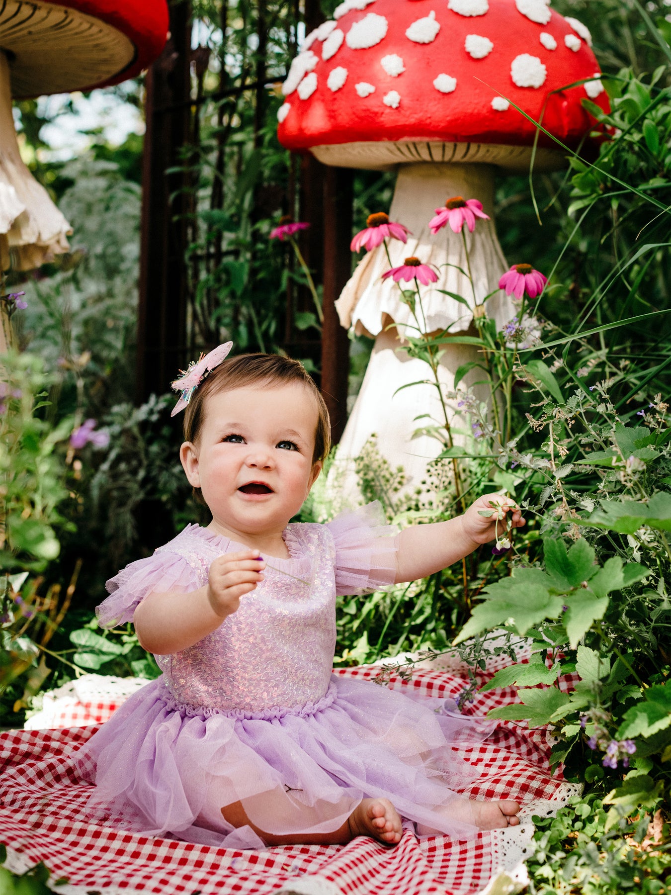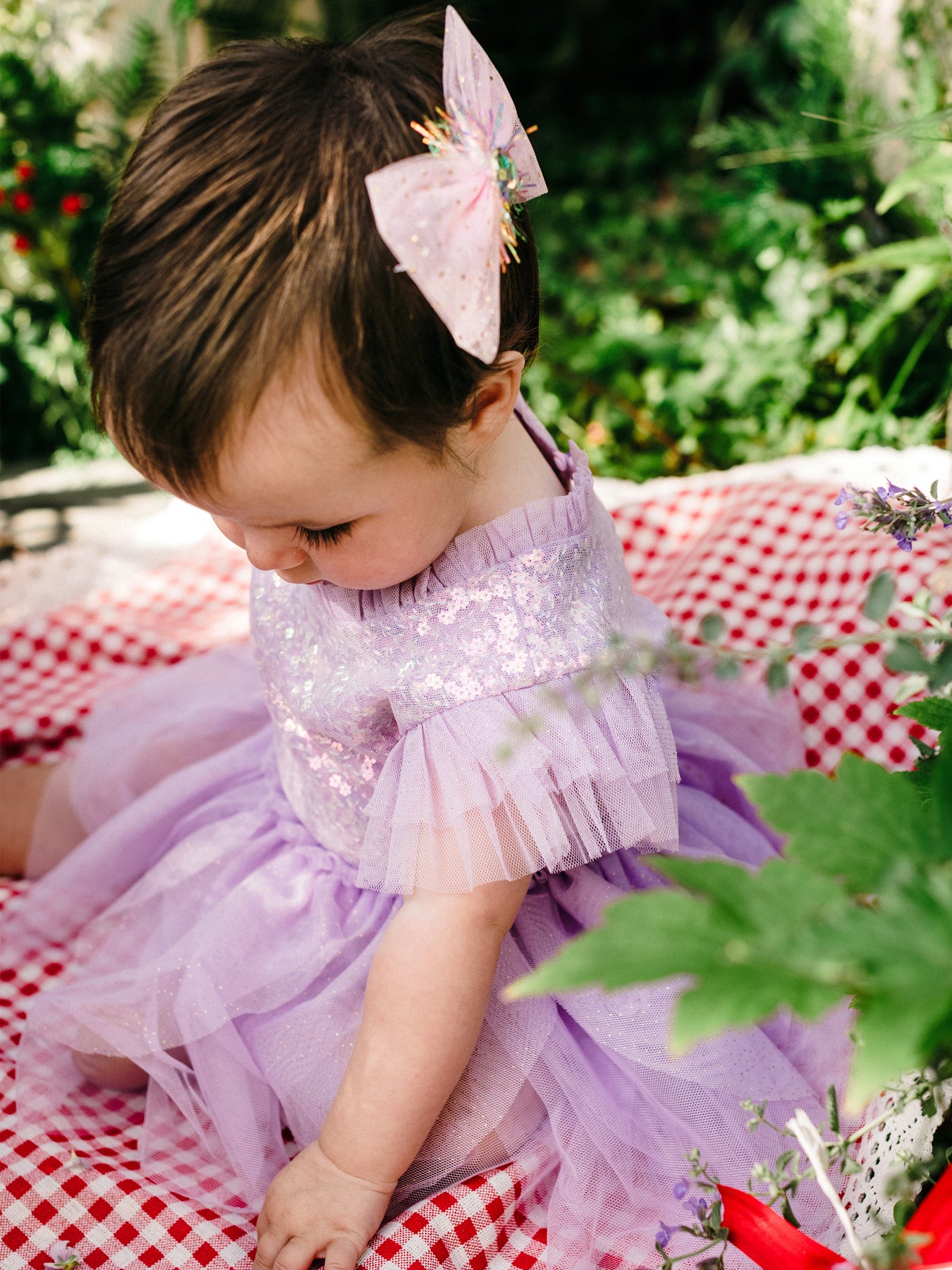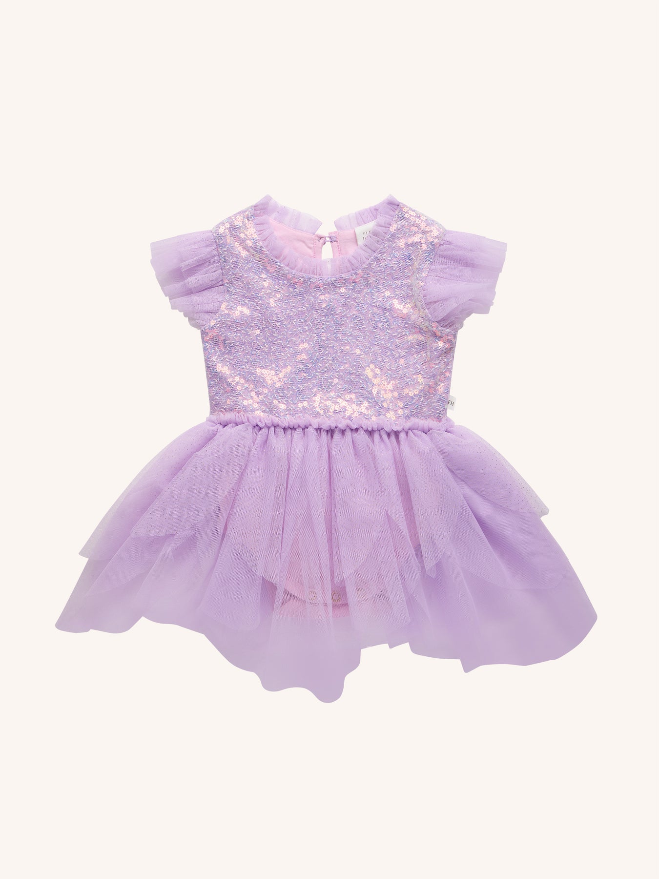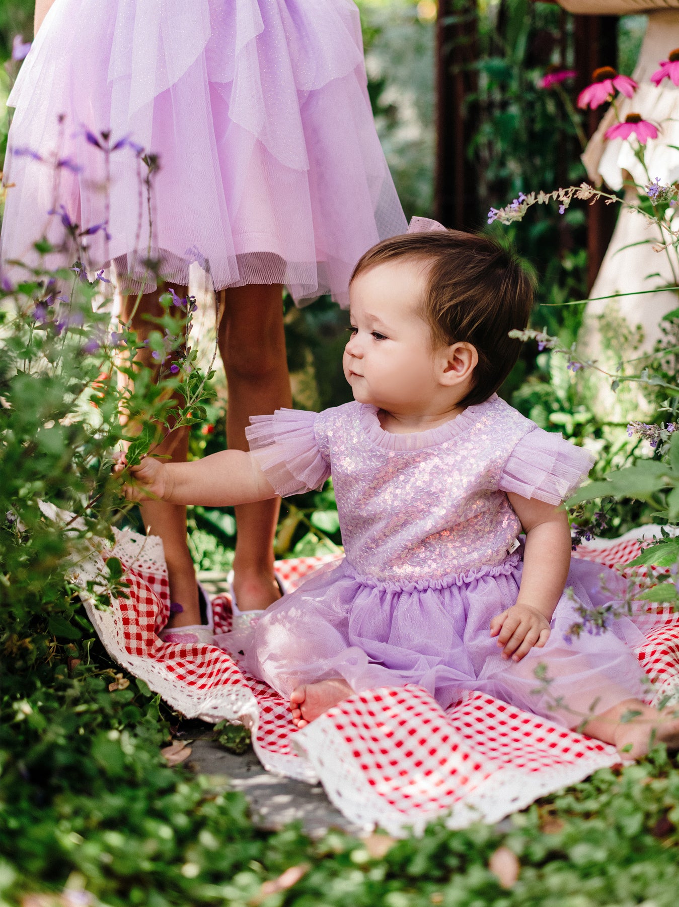 Let little imaginations soar with the ‘The Magic Faraway Tree’ Sequin Fairy Dress Baby from the Fleur Harris x Enid Blyton 'The Magic Faraway Tree' collection. Crafted from soft cotton elastane jersey with layered tulle and shimmering sequin accents, this enchanting baby and toddler dress features double gathered ruffled frill sleeves, soft petal layers of tonal tulle with gold sparkles, and a centre back keyhole for easy dressing. Finished with the FH and magic key branded pip and a swing tag that doubles as a gift tag, it’s the perfect dress for magical playdates, special occasions, or twirling into storybook adventures.
