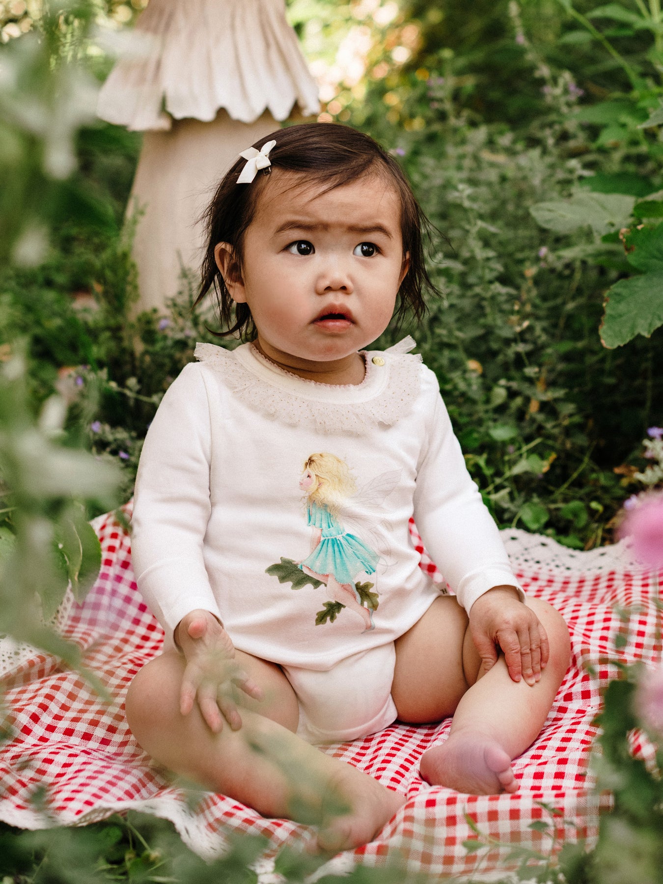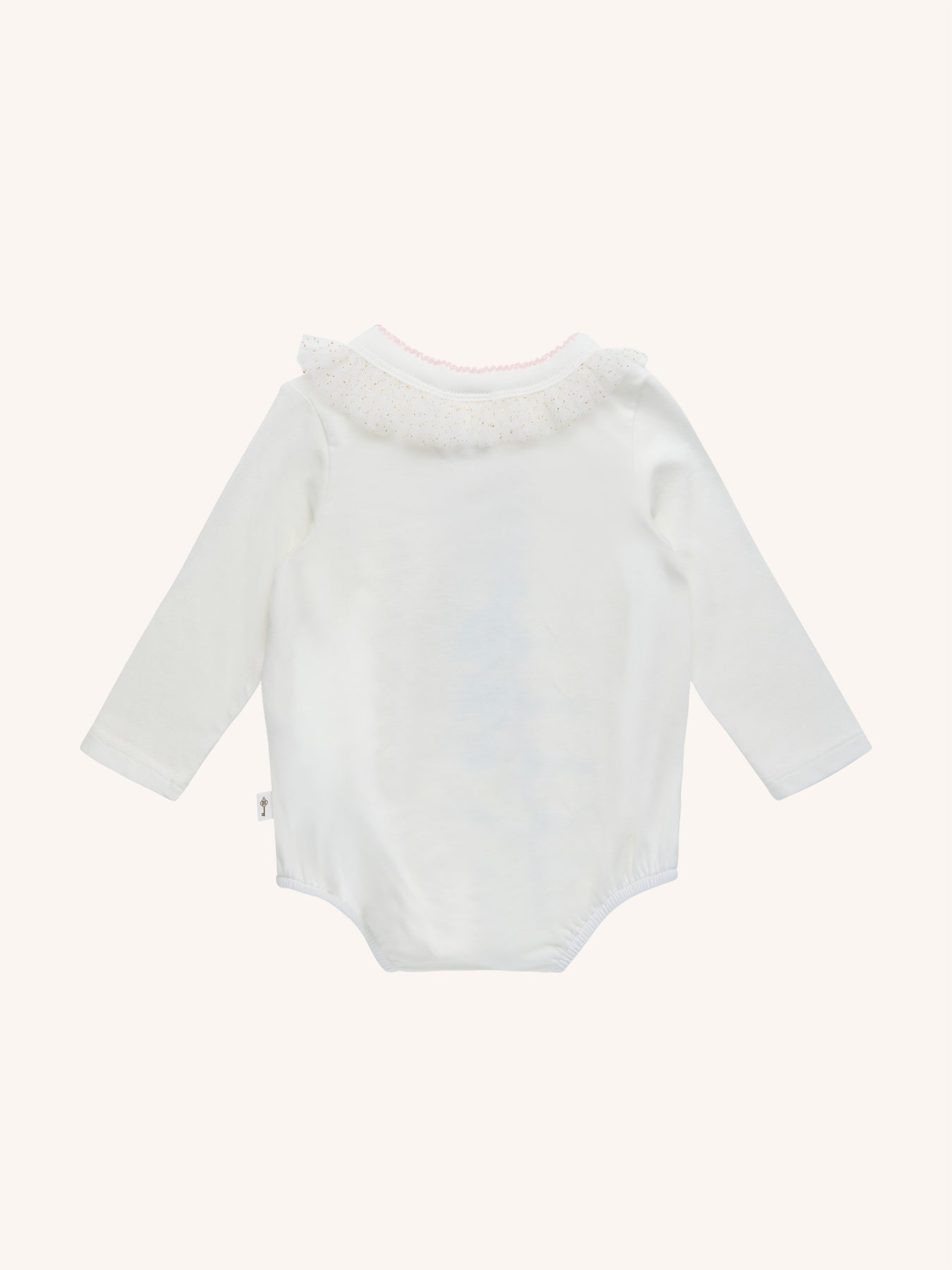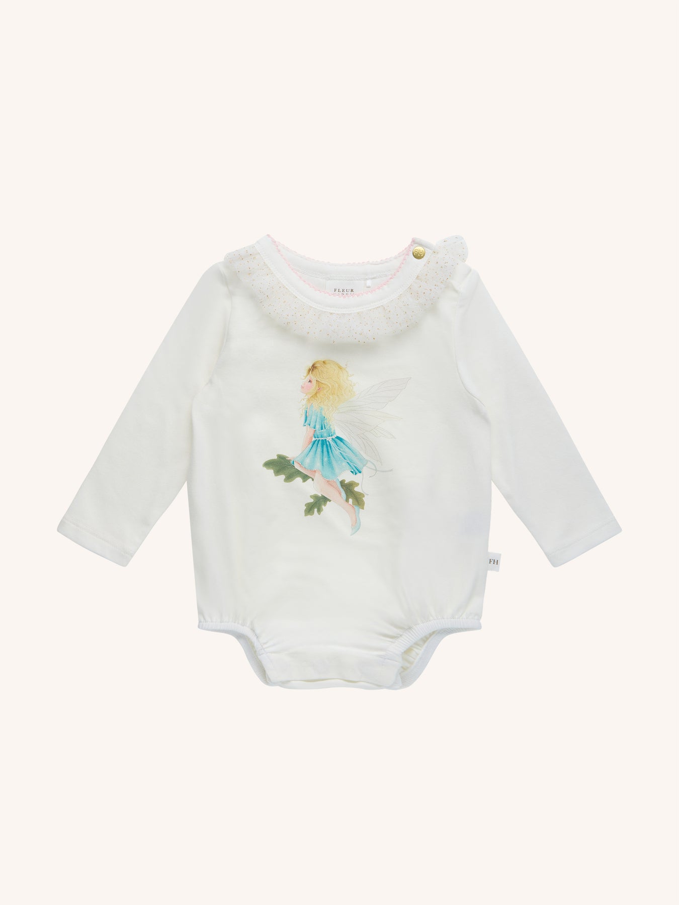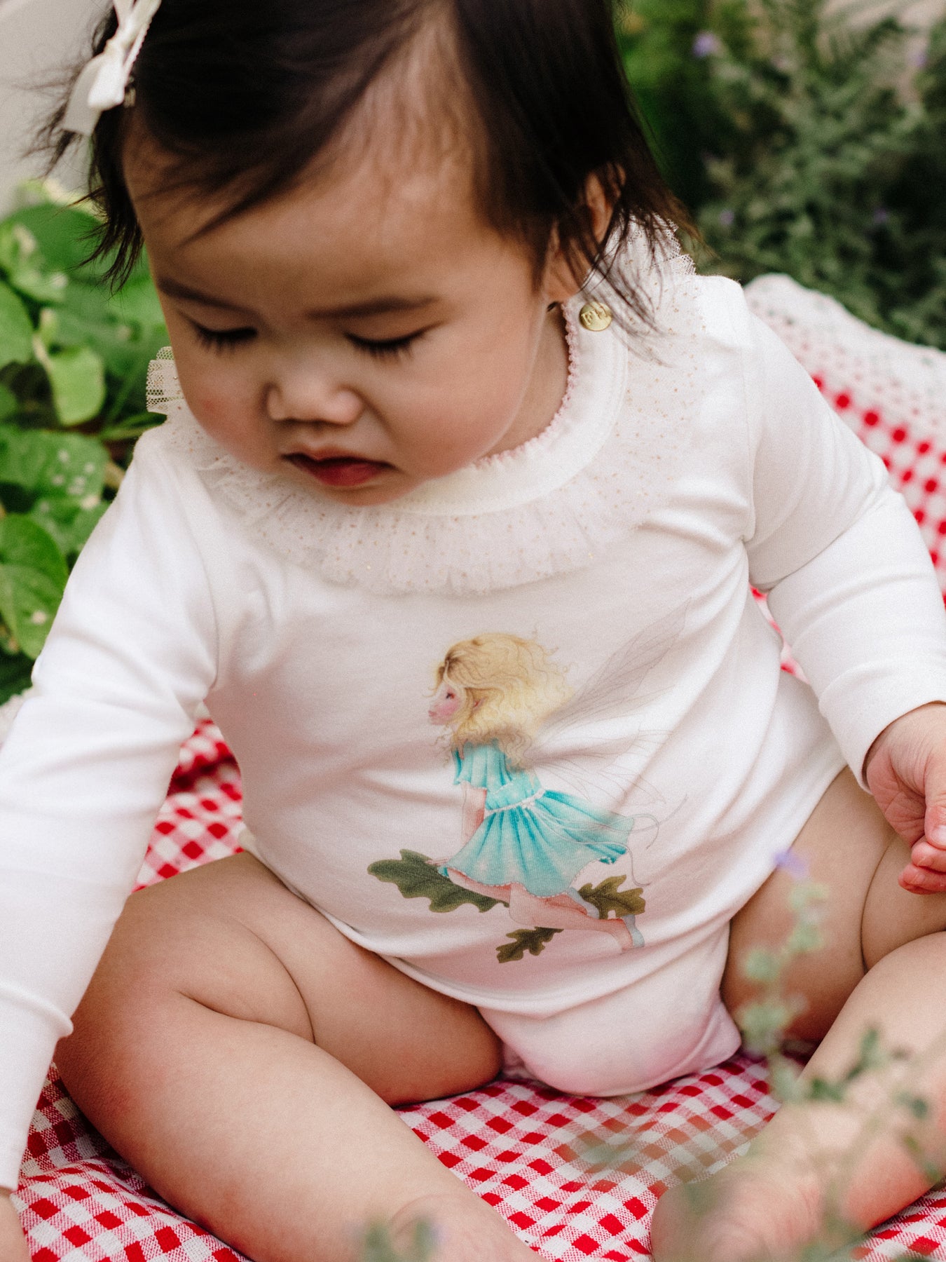 Dress your little one in enchanting detail with the 'Silky the Fairy' Frill Bodysuit from the Fleur Harris x Enid Blyton 'The Magic Faraway Tree' collection. Crafted from soft cotton elastane jersey, this bodysuit features long sleeves, a delicate gathered tulle frill at the neckline, and snaps for ease of nappy changing. Finished with the FH and magic key branded pip and a swing tag that doubles as a gift tag, it’s perfect for magical everyday wear and special storybook-inspired moments.