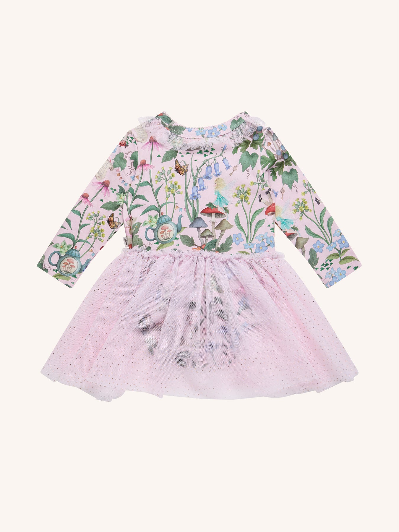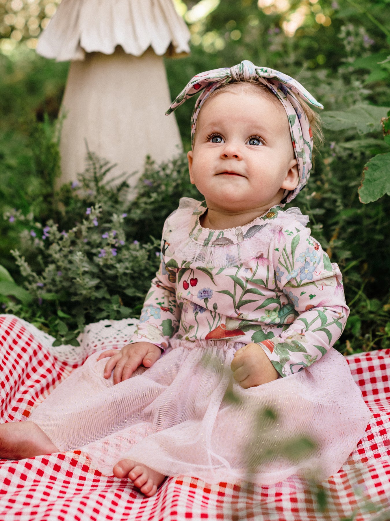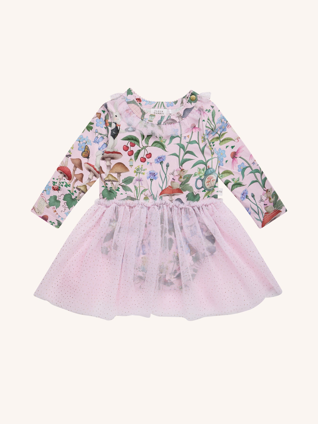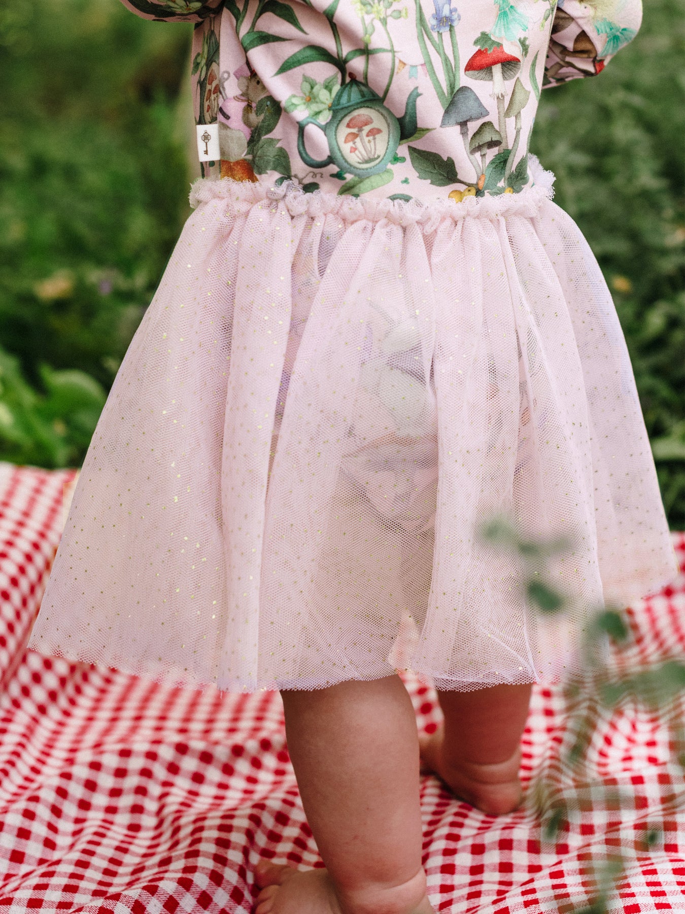 Step into a fairy-tale world with the ‘Enchanted Flowers Party’ Heavenly Tutu Dress for baby from the Fleur Harris x Enid Blyton 'The Magic Faraway Tree' collection. Crafted from soft cotton elastane jersey and layered with frilled tonal tulle adorned with gold sparkles at the neckline and skirt, this enchanting dress showcases Fleur's illustrations artwork inspired by Enid Blyton’s beloved tales. Complete with the FH and magic key branded pip and a swing tag that doubles as a gift tag, it’s the perfect dress for special occasions, playtime adventures, or creating magical memories.