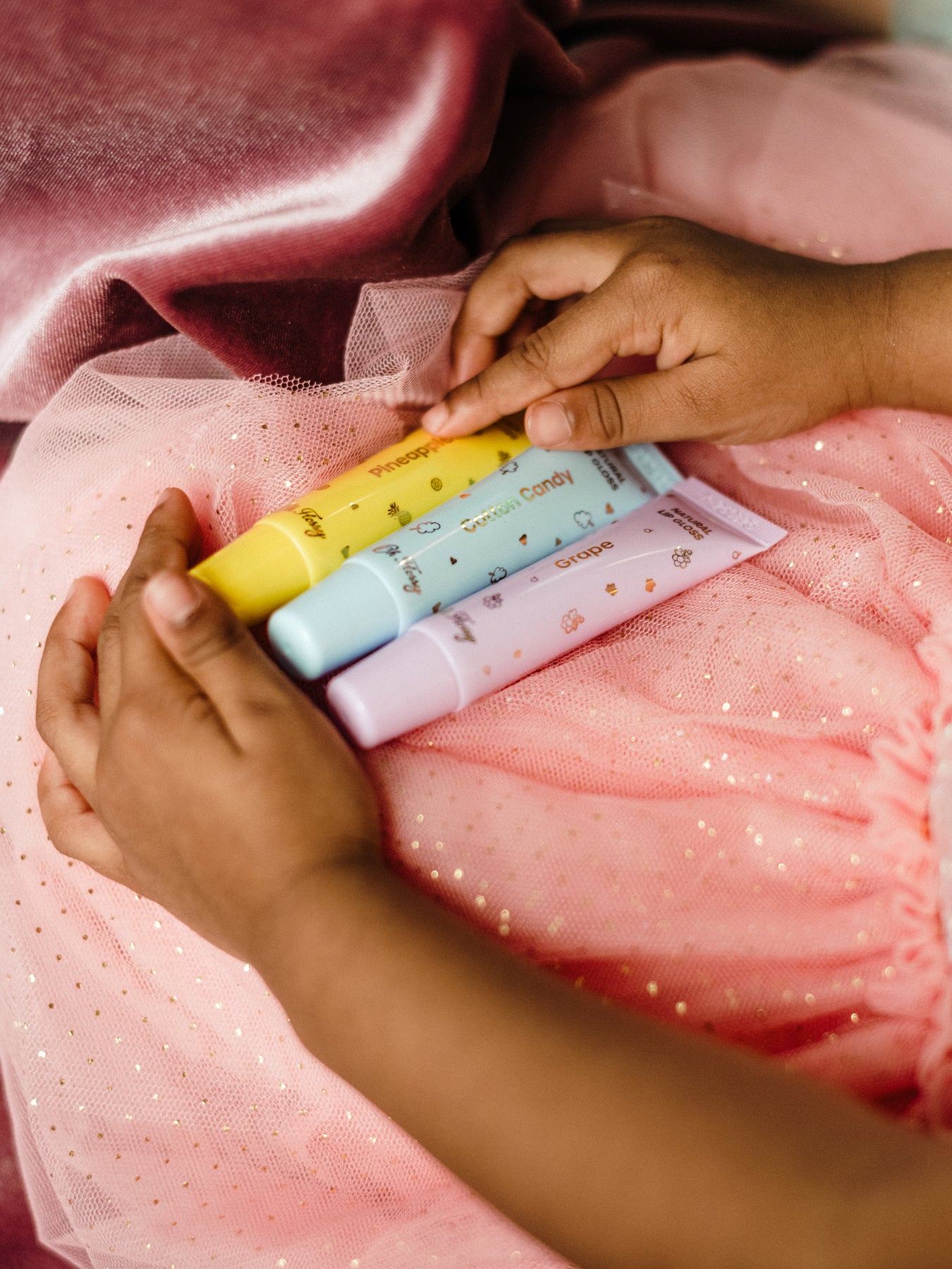 This natural lip gloss set includes three delicious flavours - Cotton Candy, Pineapple and Grape - and is proudly handmade in Australia using the best natural, vegan-friendly, biodegradable & non-toxic ingredients.